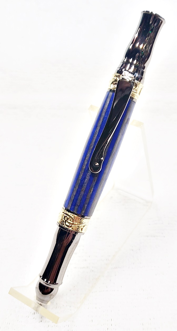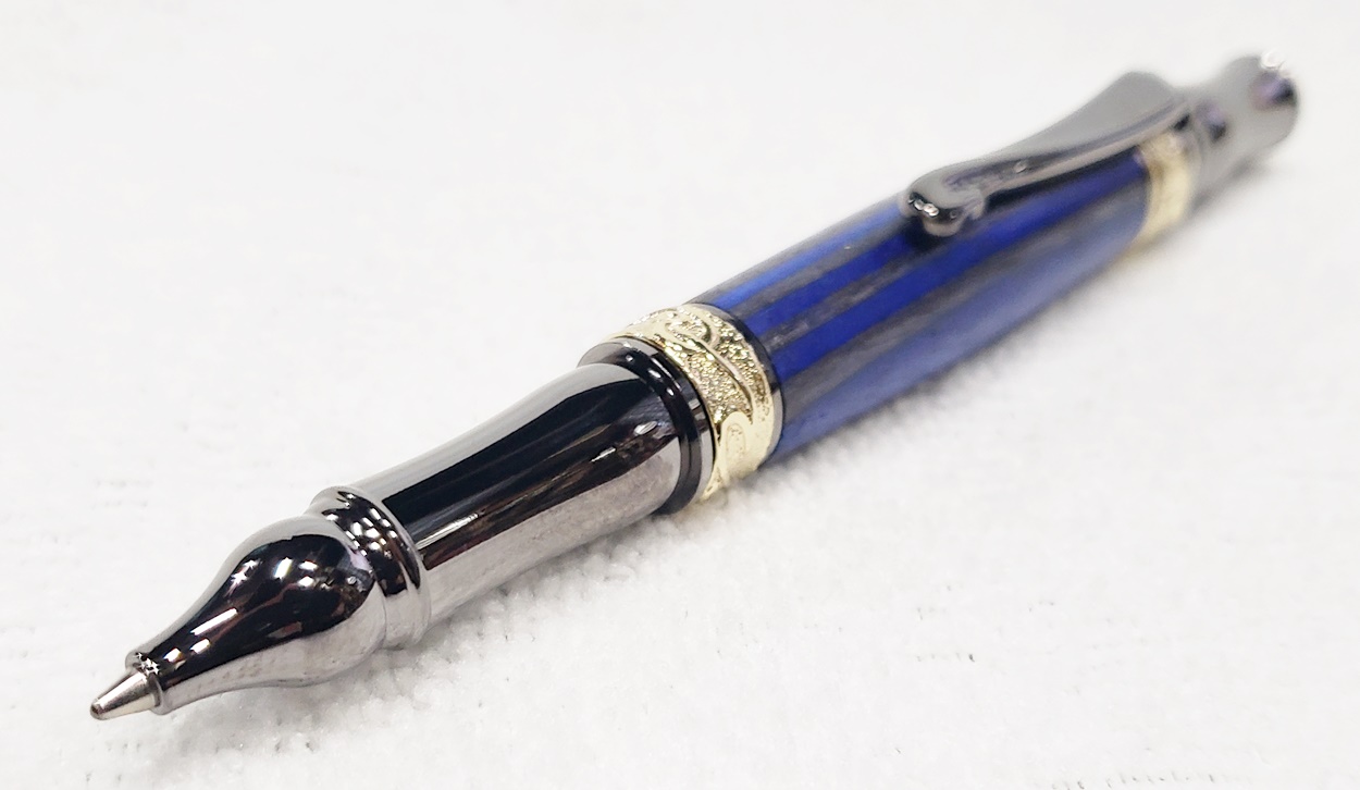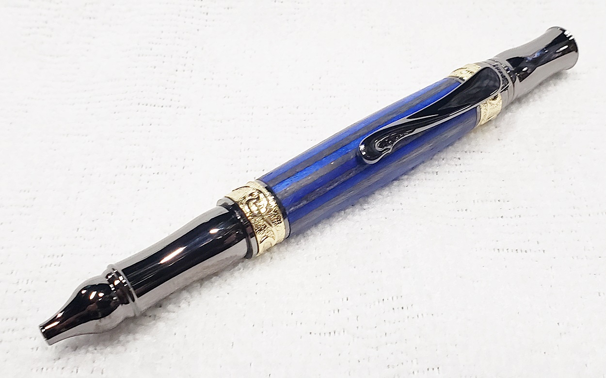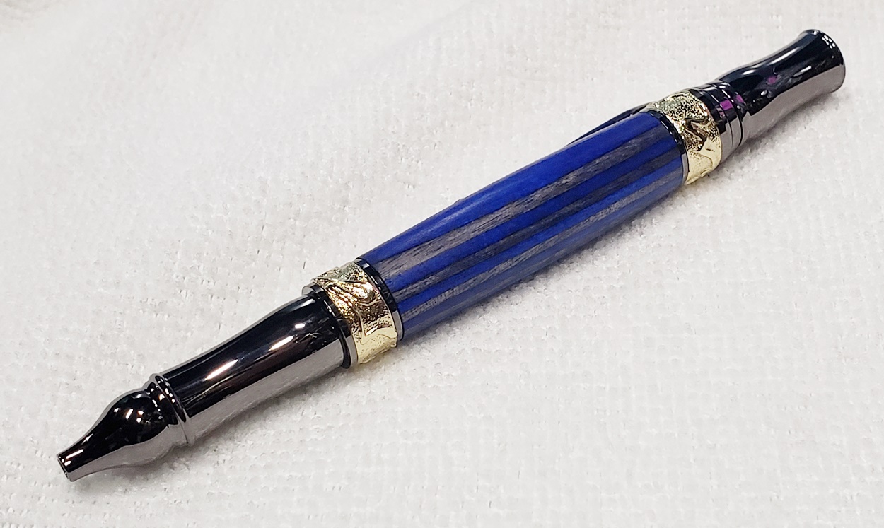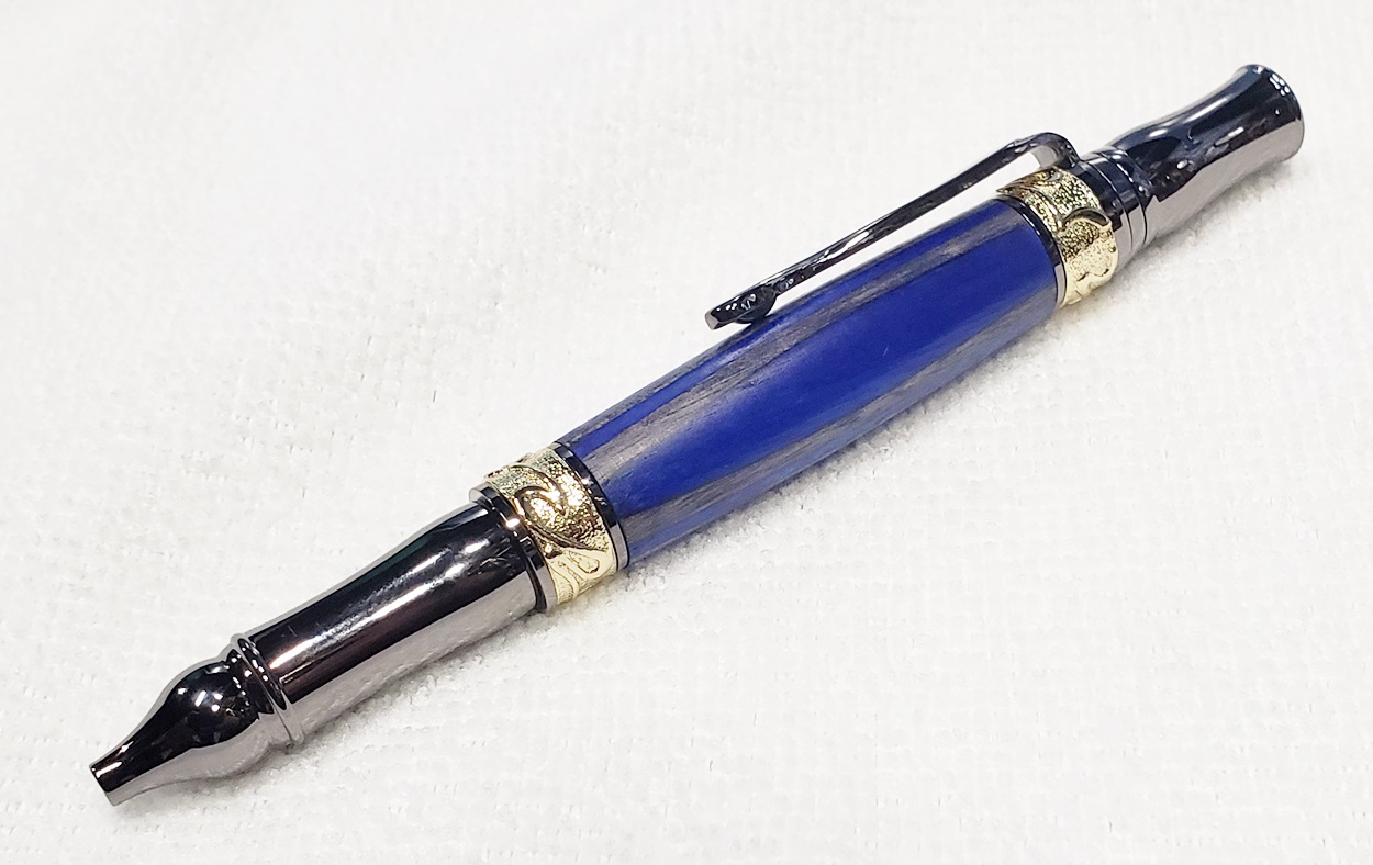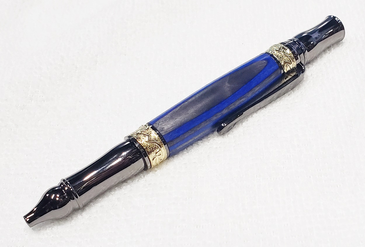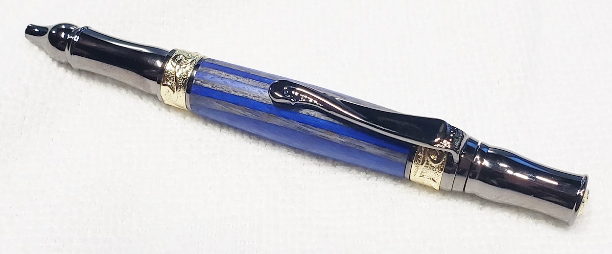 This fancy little pen is a PSI Nouveau Sceptre twist, in gunmetal and gold. The blank is a SpectraPly called Blue Angel, from Woodcraft. The finish is Pens Plus. Very pretty together.