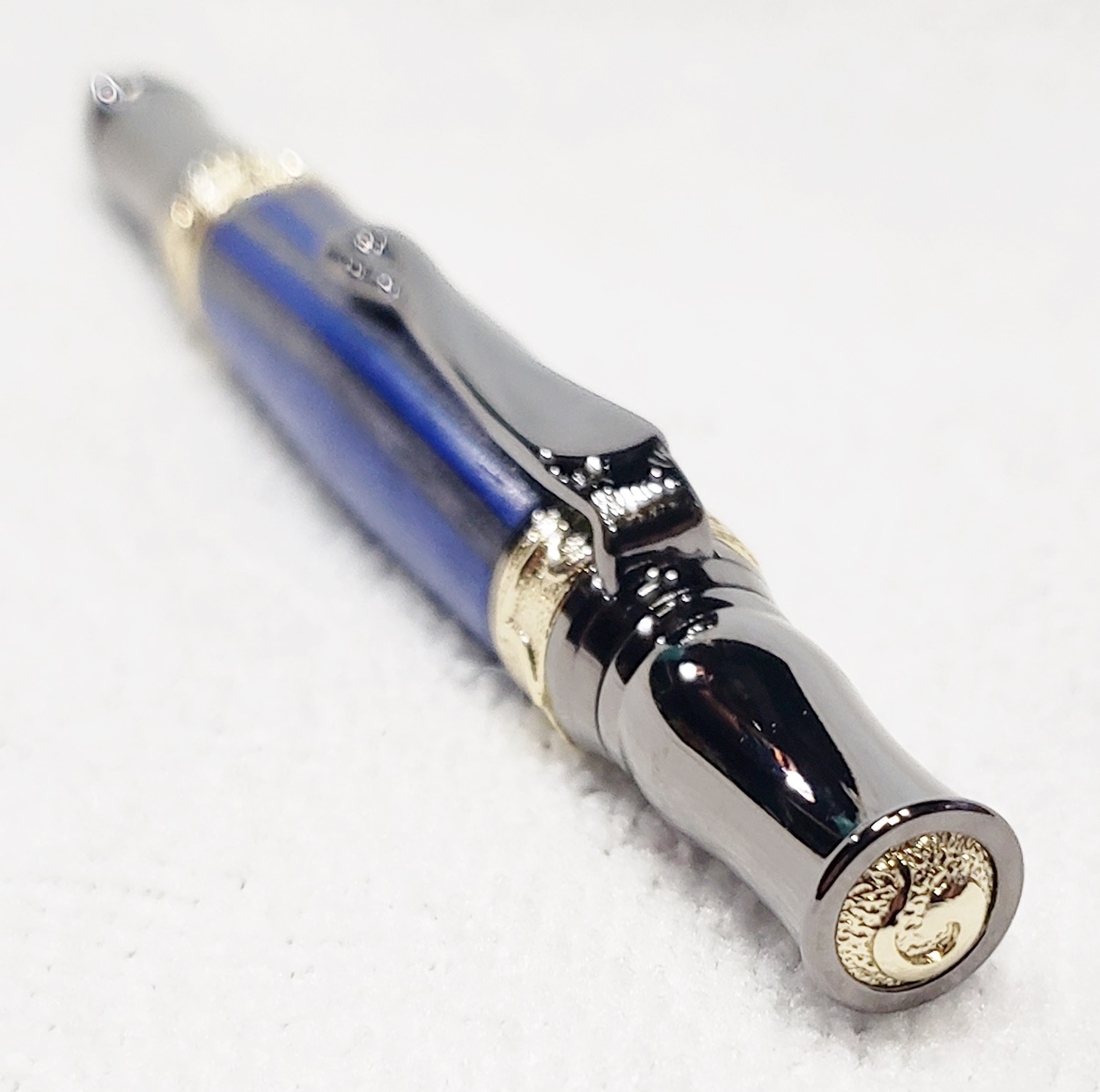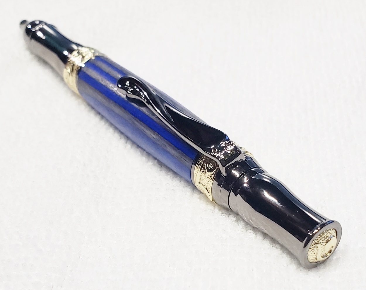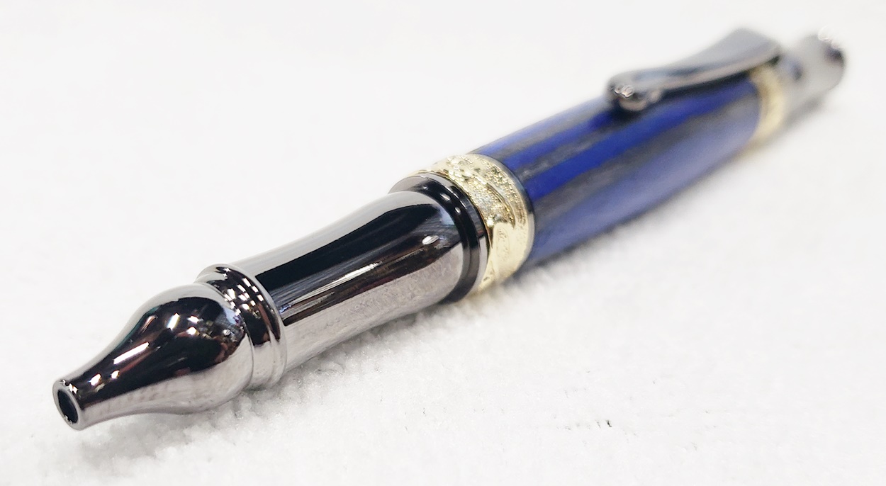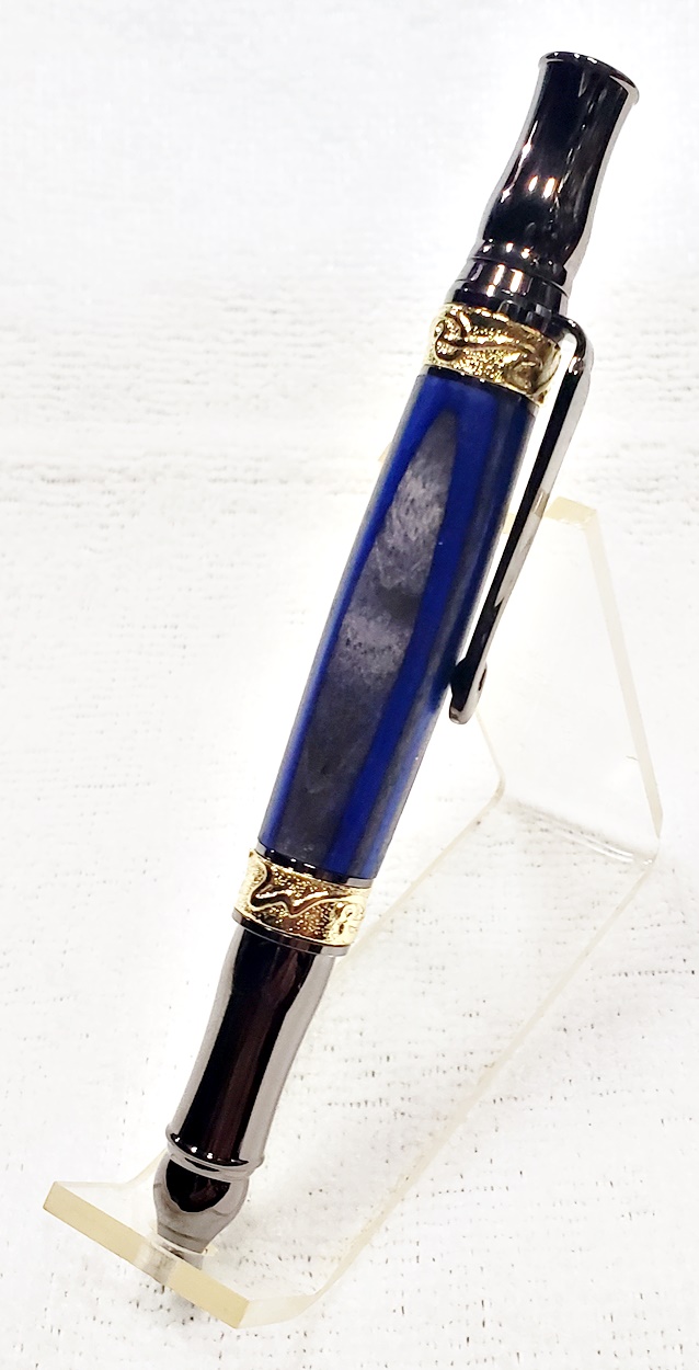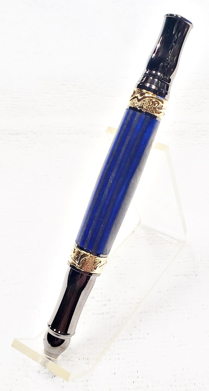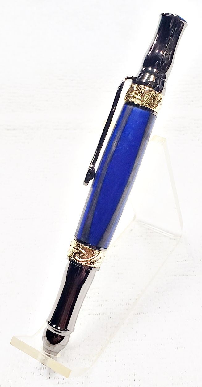 This fancy little pen is a PSI Nouveau Sceptre twist, in gunmetal and gold. The blank is a SpectraPly called Blue Angel, from Woodcraft. The finish is Pens Plus. Very pretty together.