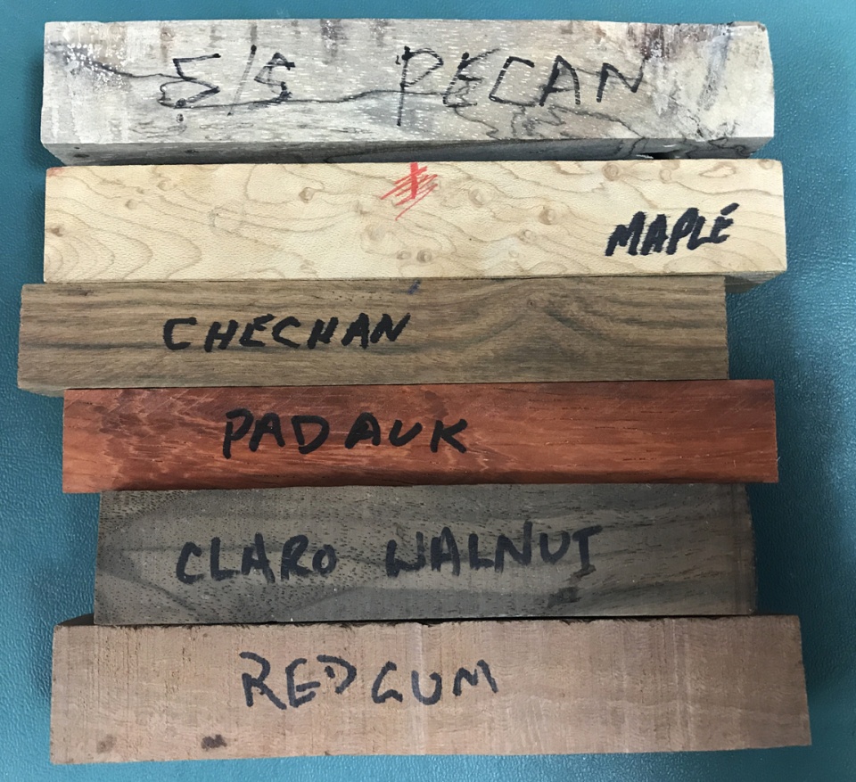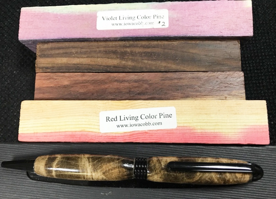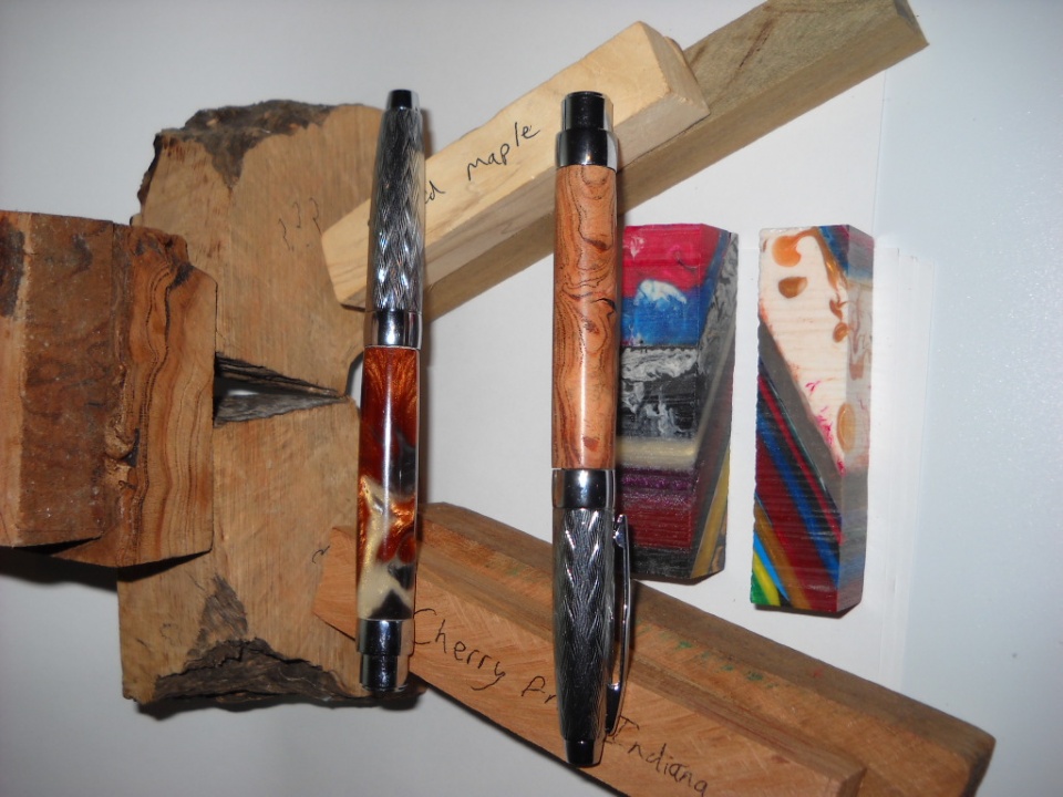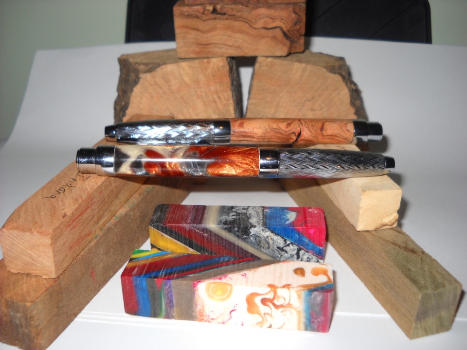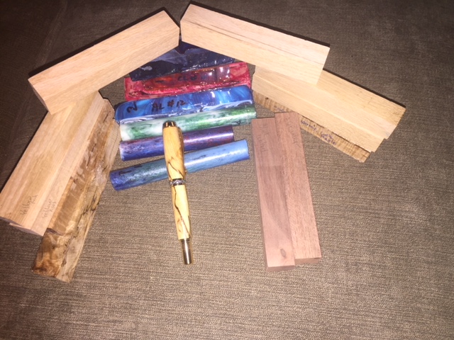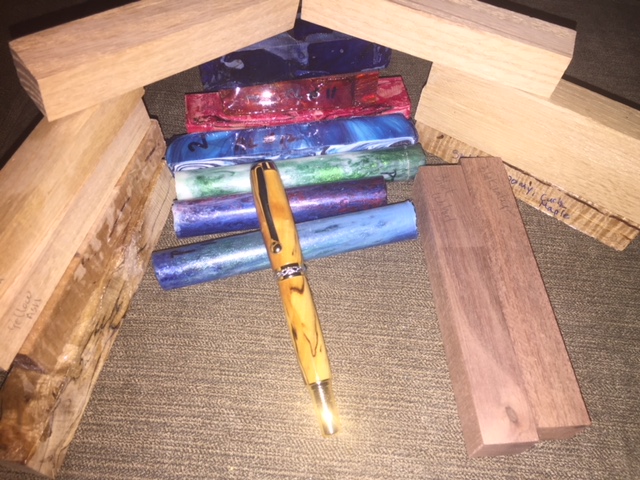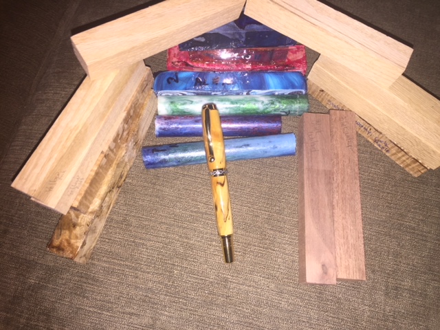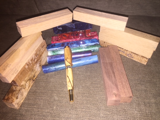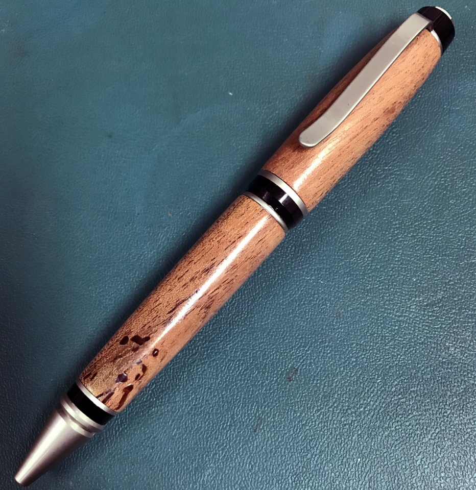 The pen is modified European made from Aspen and feather Inlaid with Cedar/Juniper, The goodies are Tagu Nuts, African Blackwood, Philippine Acacia, Australian Koa, Spalted Pecan and Spectra Ply. All but the Blackwood were from my previous swap stash. Can you guess who the Pecan was from?