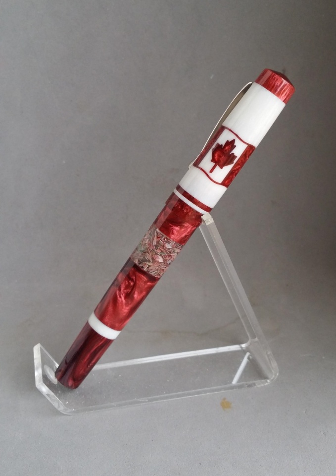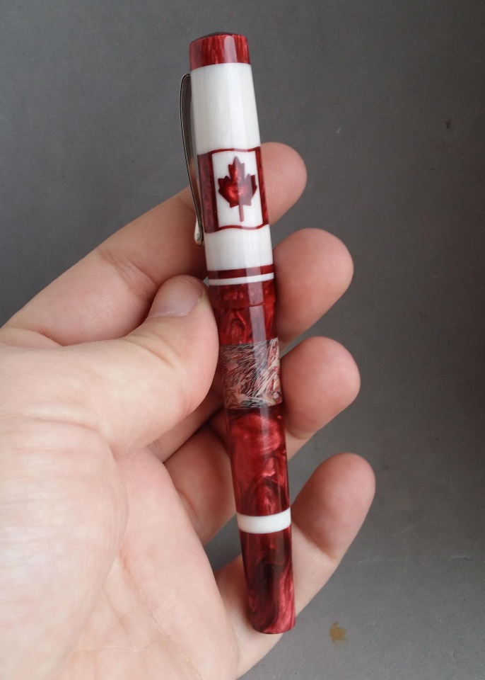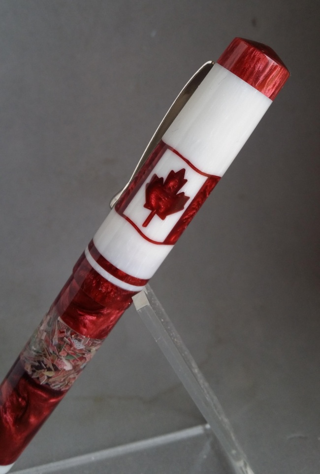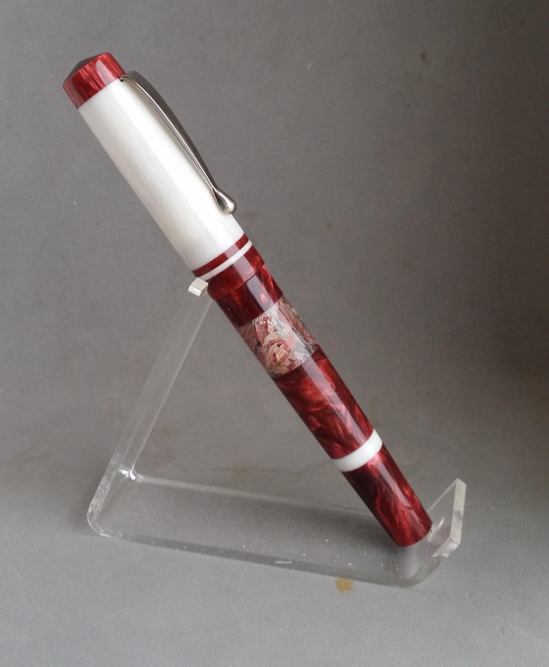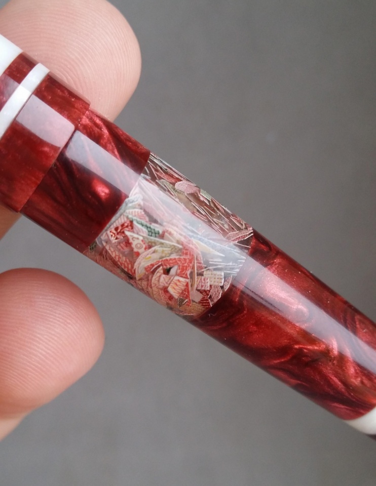 The material for this is a mash up of Jeff Powell, David Bell, and my own. I bought Jeff's Rotary Acrylic from Exotics and had to make some extra matching material myself. Anyone that has used his Rotary Acrylics knows they're not full 5" blanks since they're made with kits in mind. So I didn't have enough red to do the entire pen. I think I did a pretty good job matching Jeff's original red color. David's part comes from the shredded Canadian currency ink window. I got that blank as a thank you/trade with another member here. I sealed the ink window inside and out so it can function as a true ink window without worry about it staining from ink.