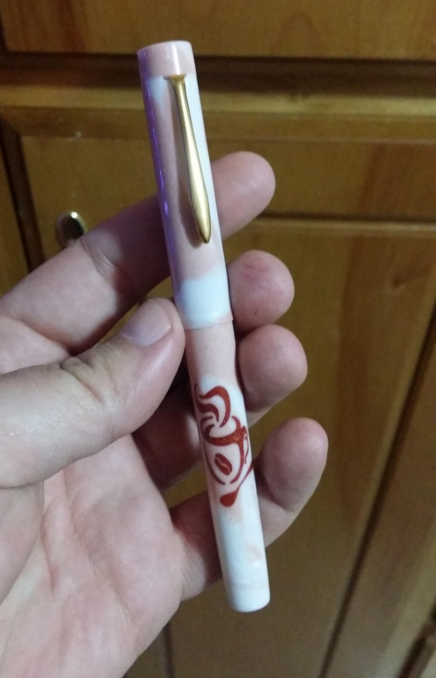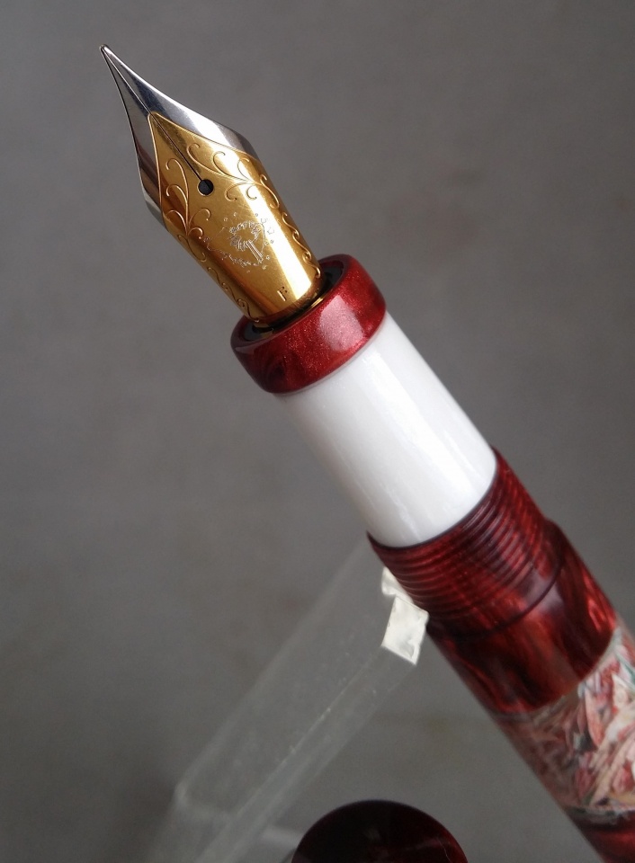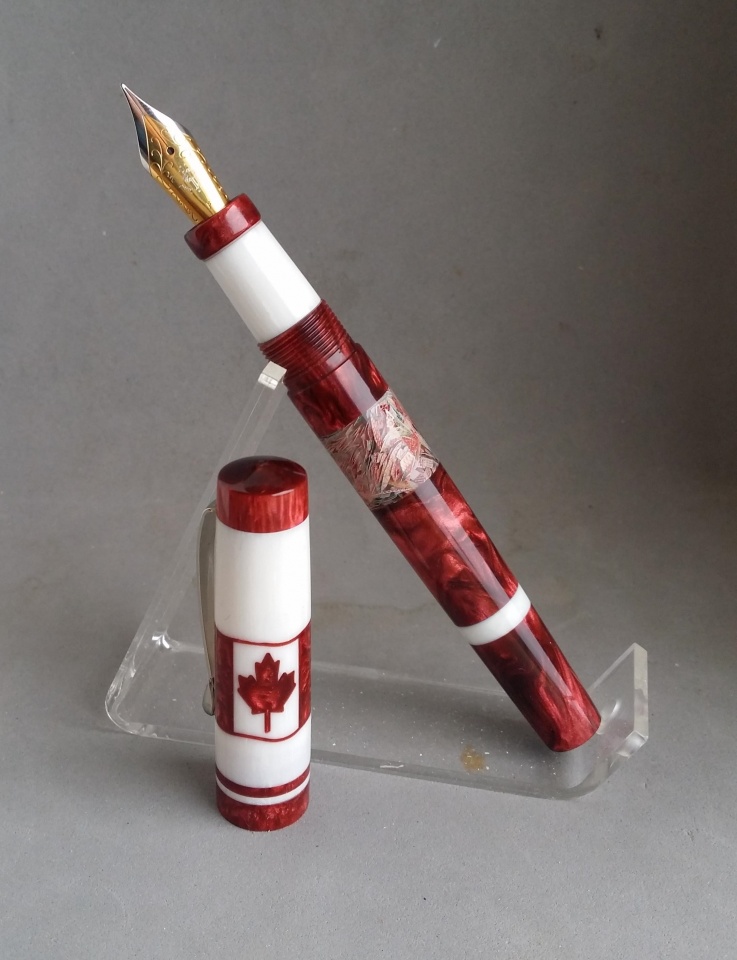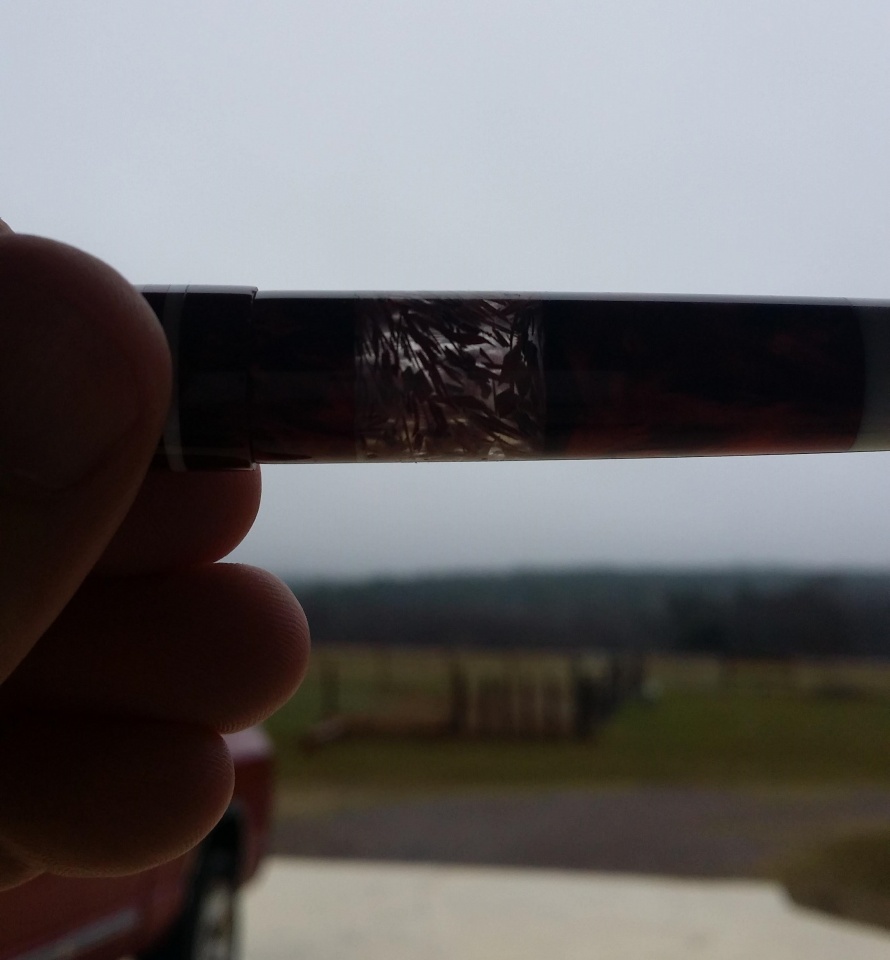 The material for this is a mash up of Jeff Powell, David Bell, and my own. I bought Jeff's Rotary Acrylic from Exotics and had to make some extra matching material myself. Anyone that has used his Rotary Acrylics knows they're not full 5" blanks since they're made with kits in mind. So I didn't have enough red to do the entire pen. I think I did a pretty good job matching Jeff's original red color. David's part comes from the shredded Canadian currency ink window. I got that blank as a thank you/trade with another member here. I sealed the ink window inside and out so it can function as a true ink window without worry about it staining from ink.