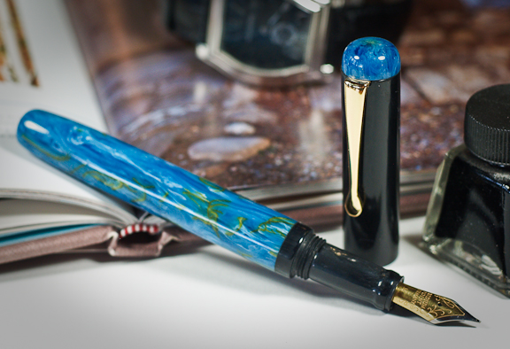 I managed to secure a substantial bakelite rod that is green with yellow swirls. As I turned, it emerged as a beautifully blue swirled piece with just traces of green. Meister nib, ebonite trim. Thanks for looking.