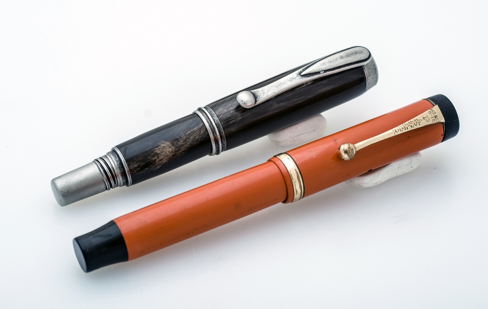 My Parker Duofold lucky curve on top (in reddish / orange ebonite),