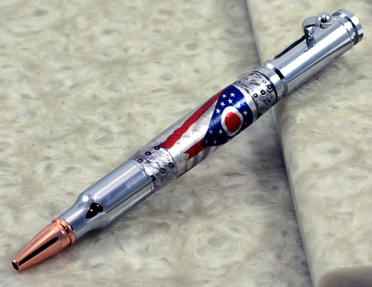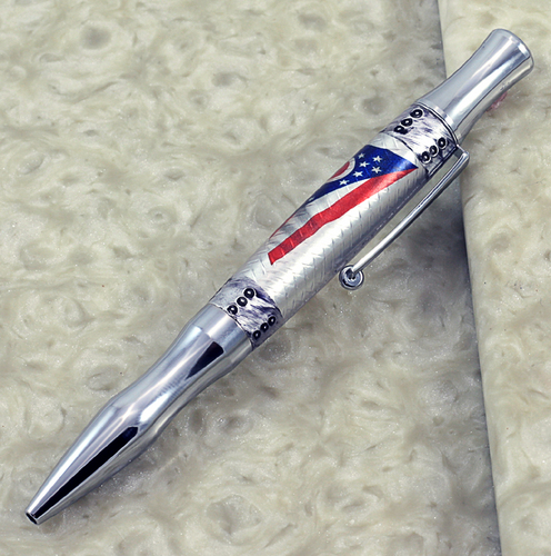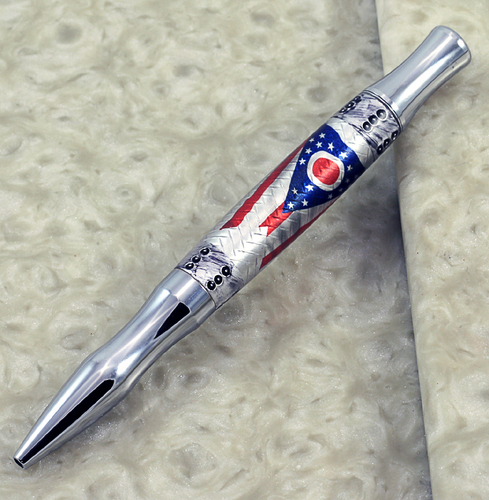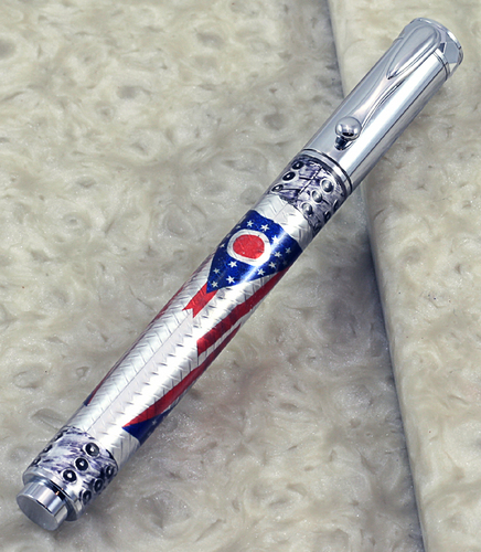 Here are several pens made with blanks I commissioned Mark Koster (Marko50), Hobble Creek Craftsman to make for me. It is Mark's work, along with other talented casters on the IAP that inspired me to jump into the casting pool. In another thread I posted about State Seal blanks I am making (or at least trying to) A former Buckeye mentioned he would like to see one. When I make one that satisfies me I'll post it. For now, maybe Mark's beautiful State of Ohio Flag blanks will do.