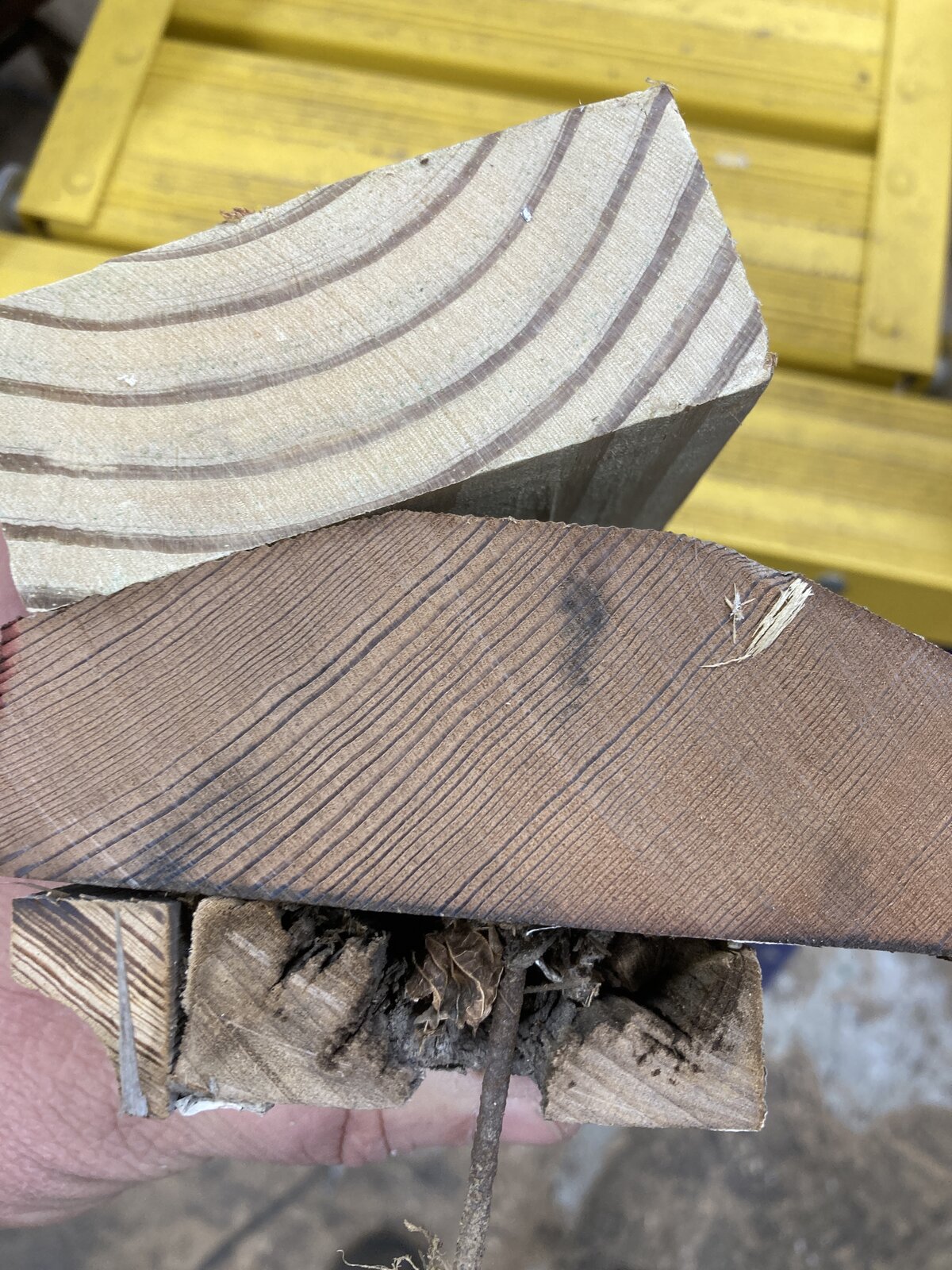 Decided I had to get rid of a lot of old rotten nail ridden porch trim previous owners had kept. I cut short pattern pieces and burned the rest. The wood was a mix of poplar and pine. Thought I would show the difference between some "old pine" and new pine. The piece of railing appears original to the porches shown in photos as far back as 1900. The new pine was a piece of treated lumber I also burnt. Look at how tight those growth rings are in the old piece.