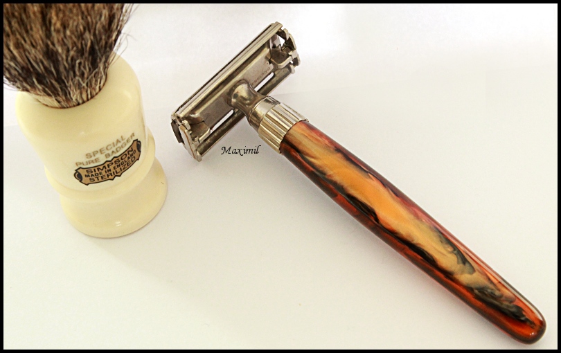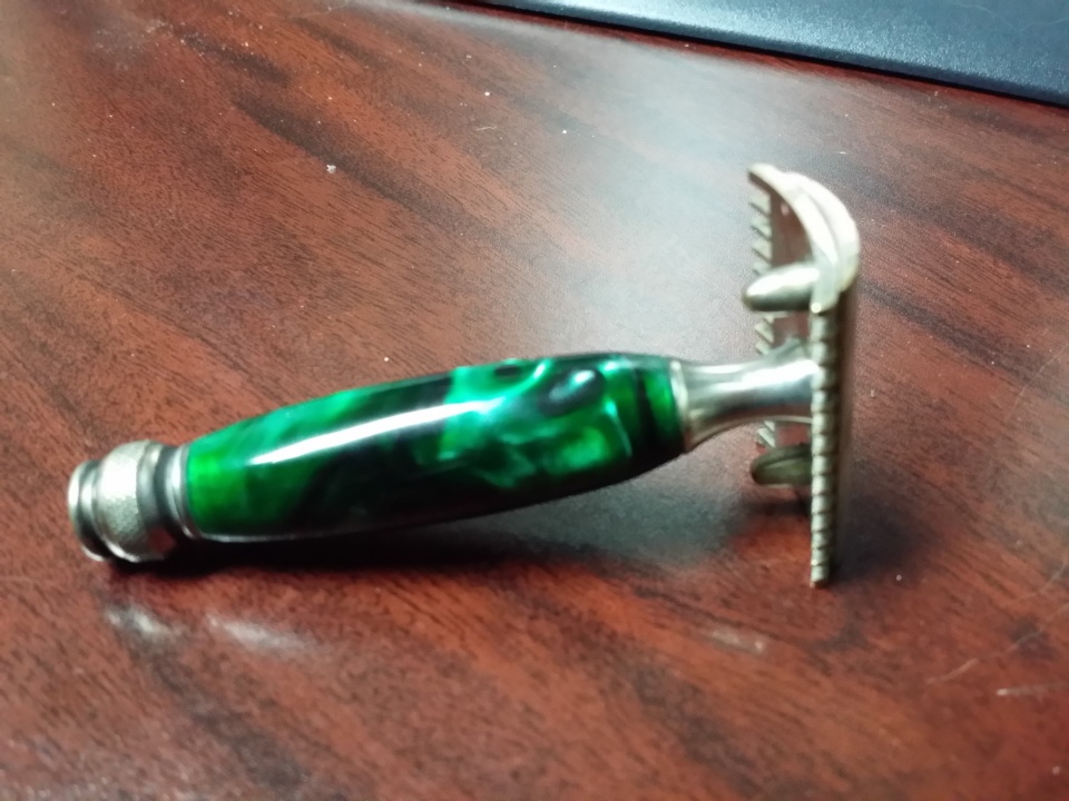 Very nice. Really like the colors in the handle. They give it a nostalgic appeal. DE razors a really the way to go if you want to enjoy shaving. Great job on the handle.