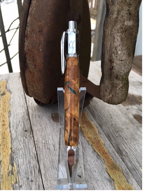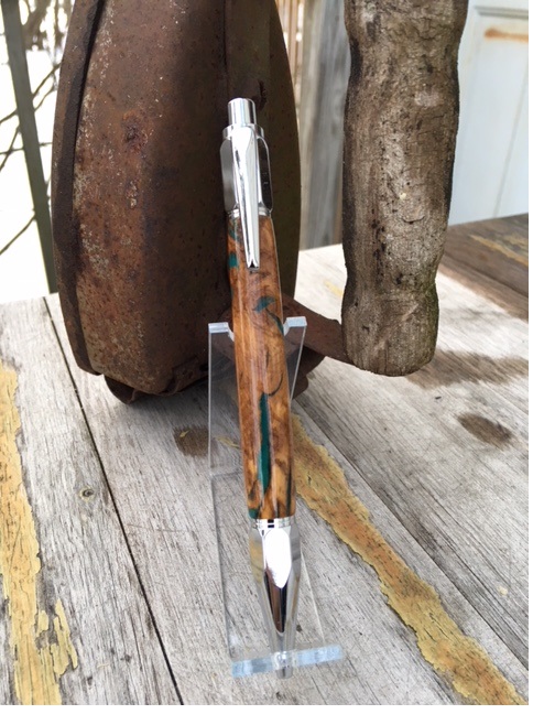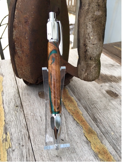 It's been a while since I posted a new pen. Finished this one today--chrome Vertex wrapped in stabilized olive root with resin filler. Was simply going to buff it out, but there were 2 very small voids in the center--so filled and added a Mercury CA finish.