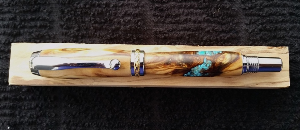 Productive day in the shop, polished up an LSU duck call for the highest bidder at yesterdays benefit, did a little cutting and gluing for up coming projects, and made this Olive Wood pen from Bethlehem, has beautiful grain and had a couple of soft spots that I ended up filling with crushed turquoise. Thanks for the Olive Wood Danny Comb.