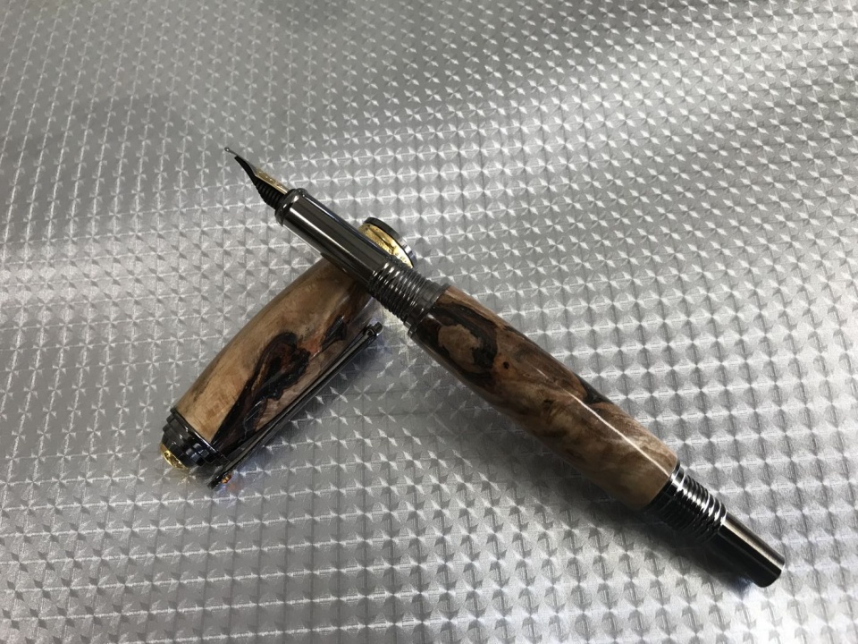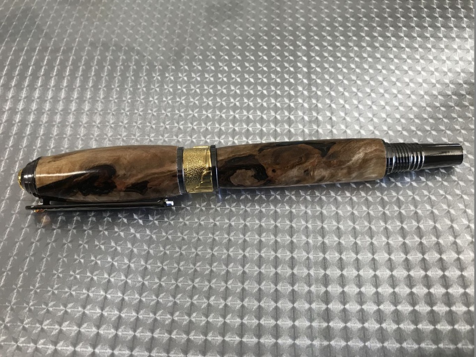 Using a piece of an unidentified wood from a local riverbank, that was stabilized, said pen was turned. With the water connection and the fact that there is some character in the wood, I think he will like it.