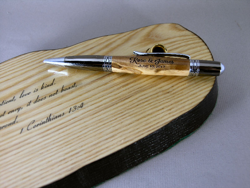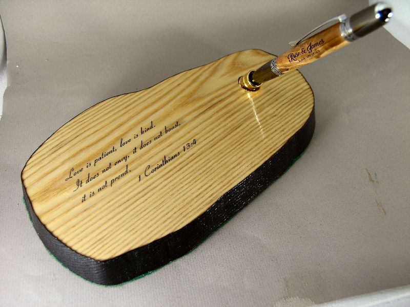One of the women at church is getting married so I made this one for her. She chose the pen. The stand is Ash and I burnt the edges to get the black then poly over all. The text is done with a decal.