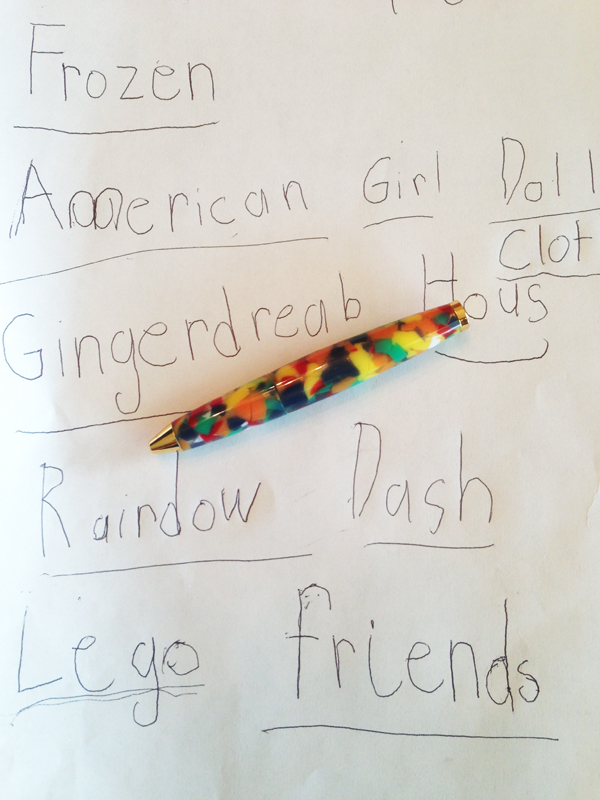 She proceeded to use the pen to make something for me -- a list of things she wants for Easter.