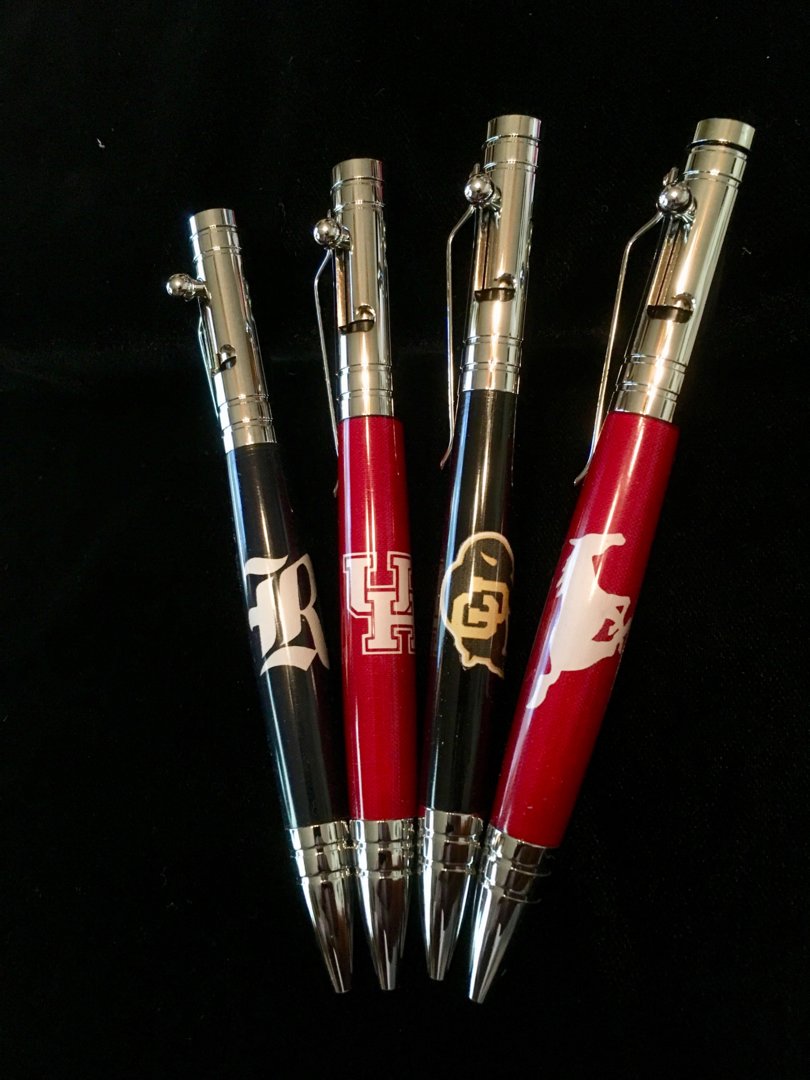 Thanks for the complements. They're a lot of work but look nice once finished. My next step is to try two different colors of vinyl on one logo. The biggest problem is my computer skills. Also those are two different sets of pens. One for my son and the other for his boss. They just so happen to work at the same schools just not at the same time.