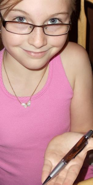 My daughter Grace (9) turned her first pen from start to finish today!! She used a Wall St II kit in Satin. The wood she chose is Zebra Wood. The finish is a BLO / CA finish she learned while watching William Young do it on You Tube. She gave it straight to her Grandma who is here visiting. She is all smiles and can't wait to turn her next one.