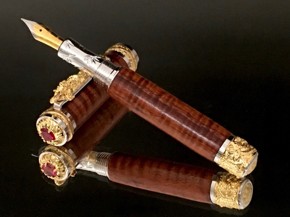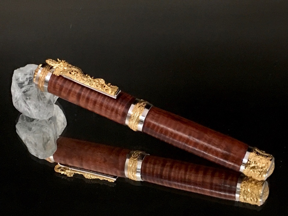 I received an Oriental Dragon kit in a trade with another IAP member. I think it's a little "blingy" for my personal taste, but I thought I'd give it a try. I purchased one of Steve Guzy's highly figured Koa blanks and was delighted with it. What you see is the combination of the two. Finished with Myland's melamine lacquer.