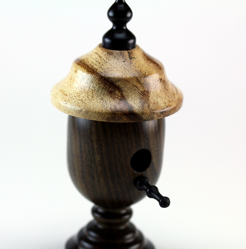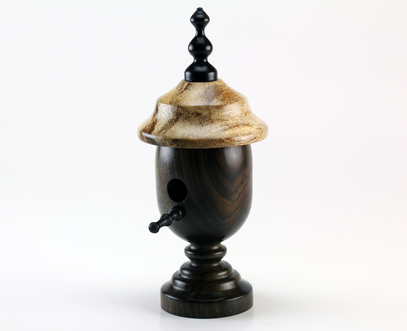 After much persistence from my wife, I finally tried my hand at a bird house ornament she has been requesting. I like the Texas ebony so much I modified what typically hangs from a tree or ornament stand and left a base on the house. The roof is spalted maple and the two finials are ebony. Many firsts on this project to include the small finials. I have quite a bit of improving to do on the finial design. I also had trouble parting them cleanly. The bird house is 4 1/2" from base to the tip of the finial.