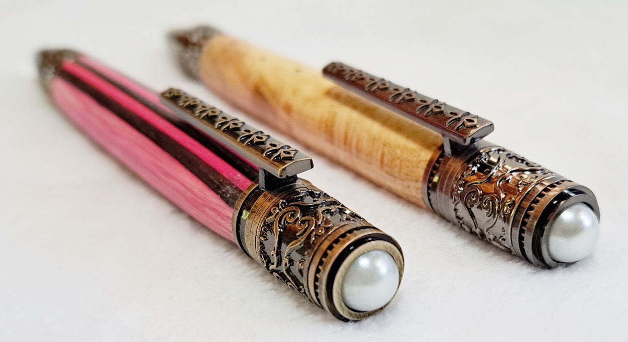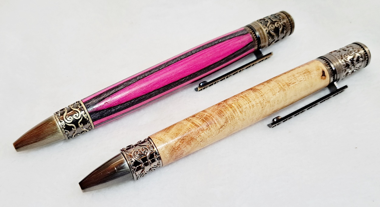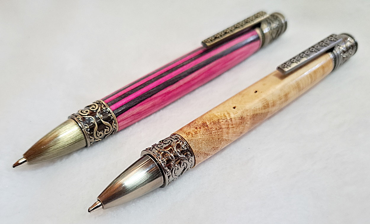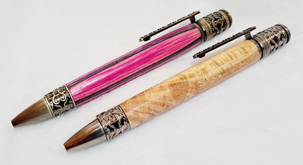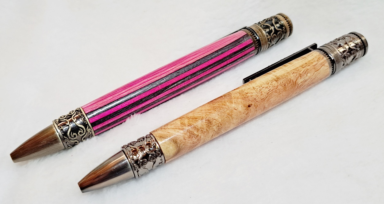 These are two Ornate Pearl twist pens from Crooked Mill. One is locust tree burl and the other is Pink Lady SpectraPly. Both are finished with Mylands and carnuba wax.