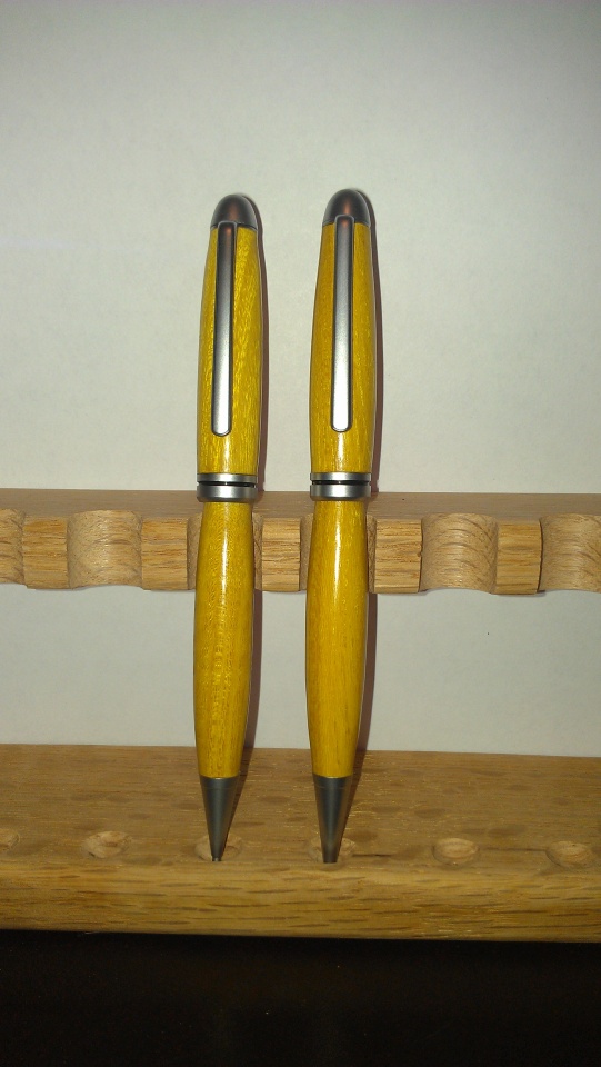 I made the pen to match the pencil I made yesterday, tried to get the turnings to match as best as I could. The Pencil from yesterday is on the left and the pen is on the right. Thanks for looking, Erik