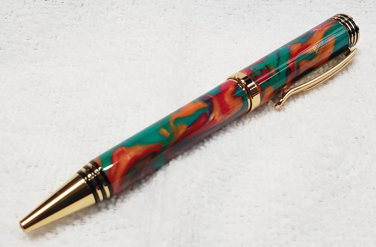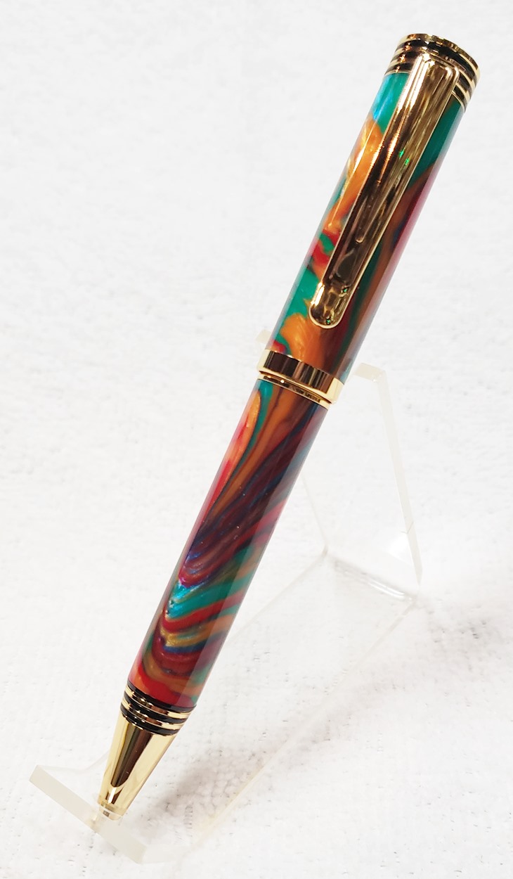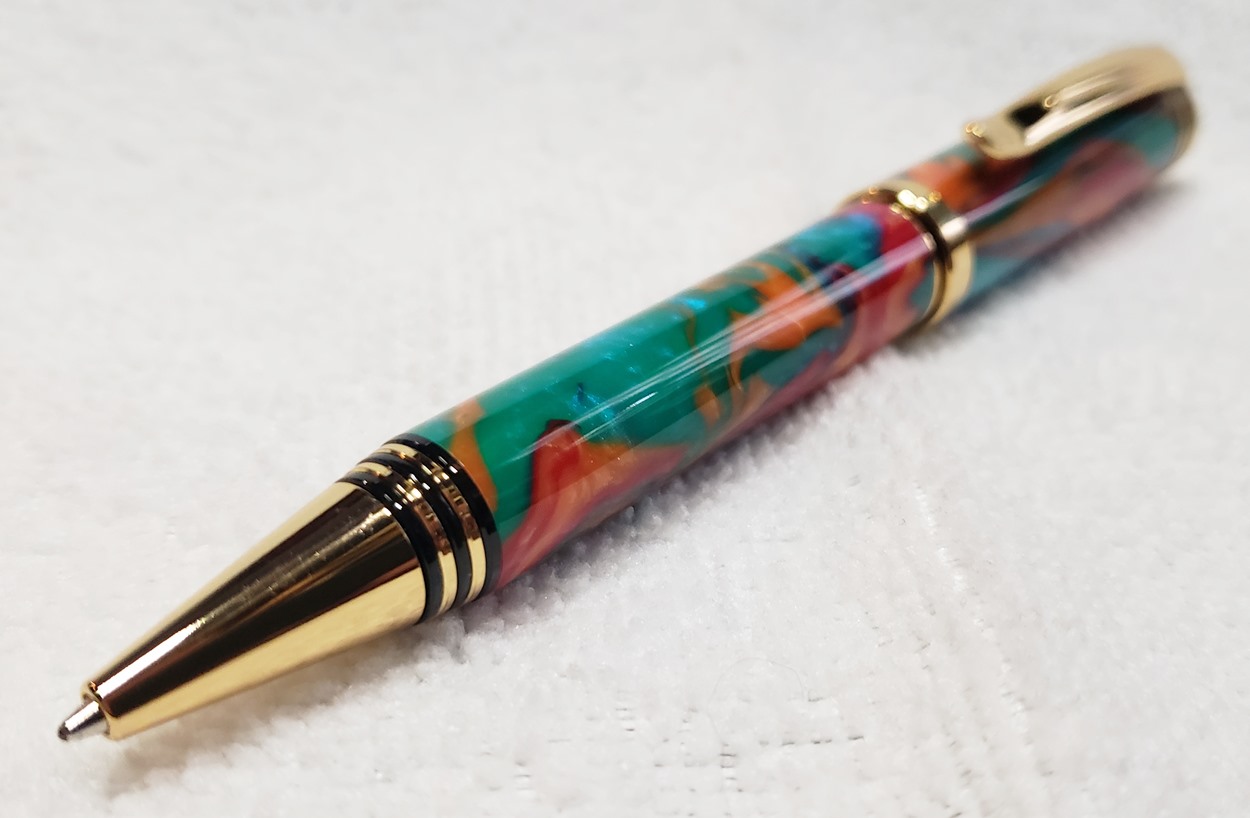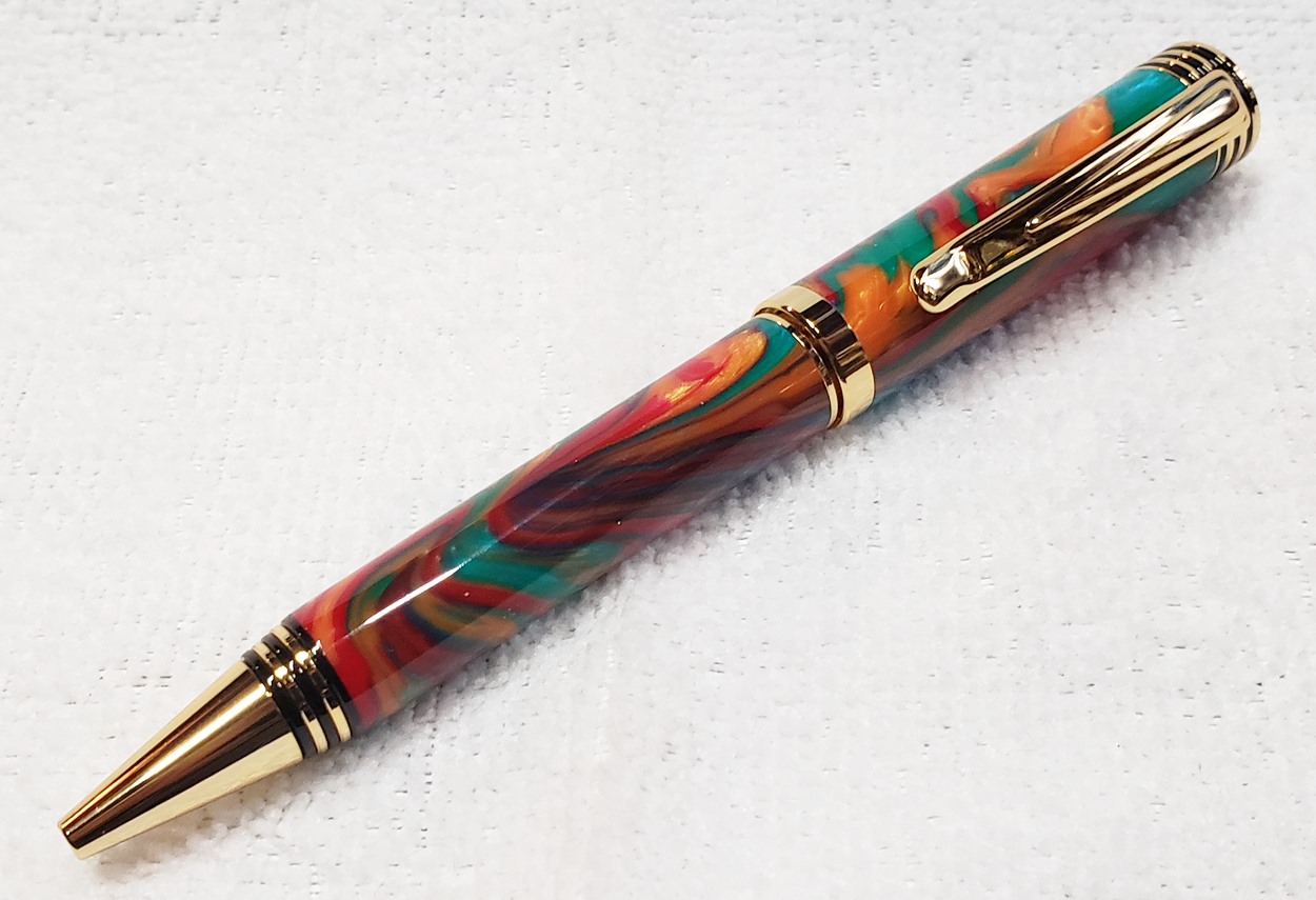This is a Dayacom Oscar, in gold and black chrome, from Turners Warehouse. The blank is an inlace acrylester called Tie-Dye, from Woodturningz. I like the combination more than I thought I would.