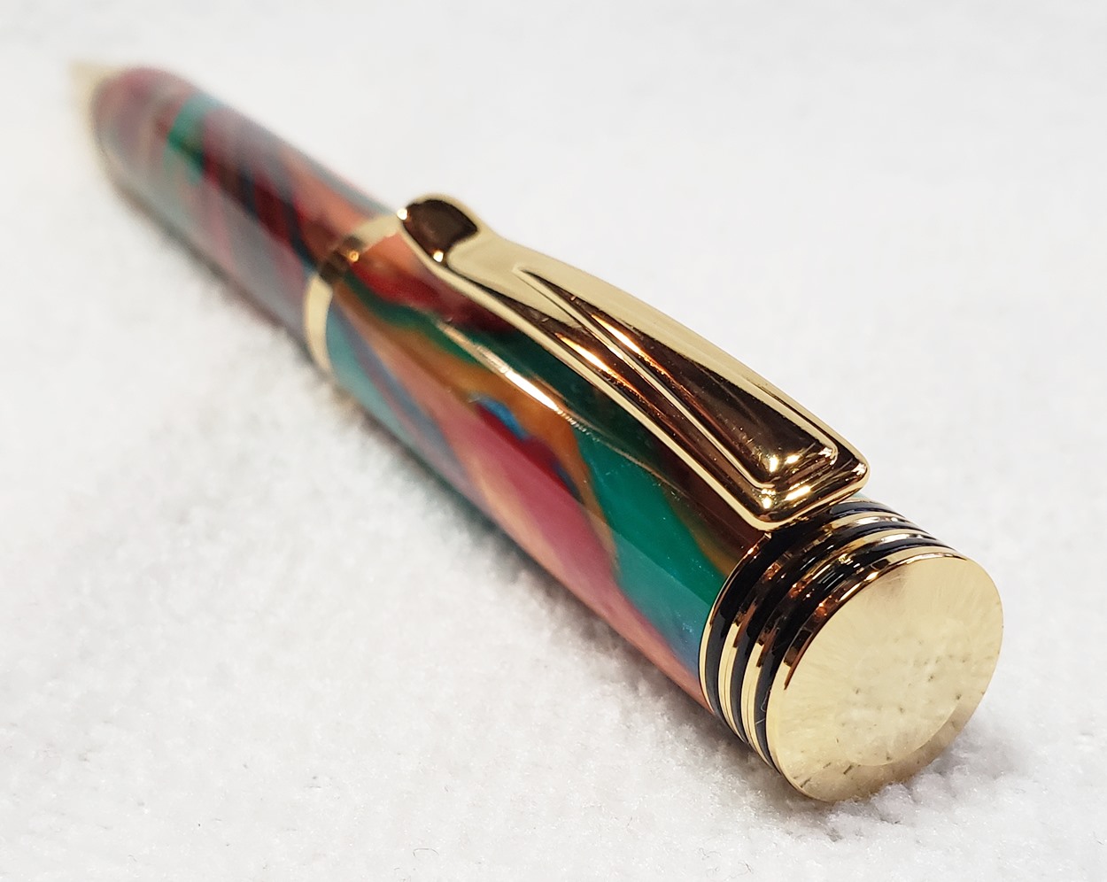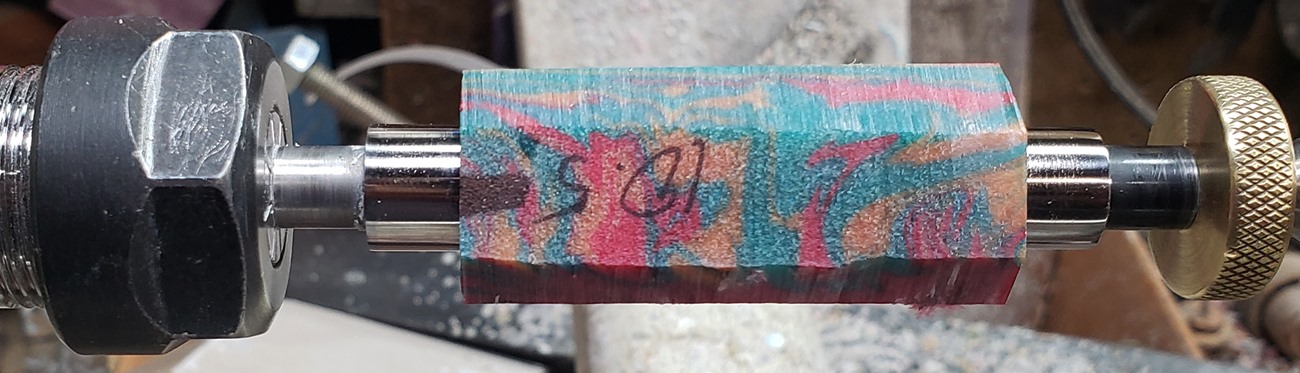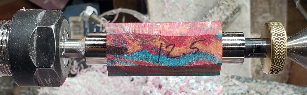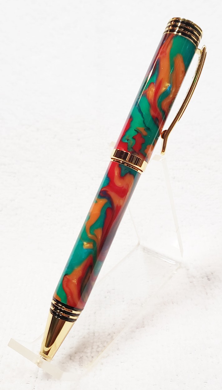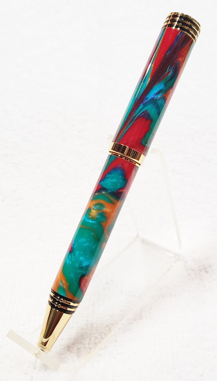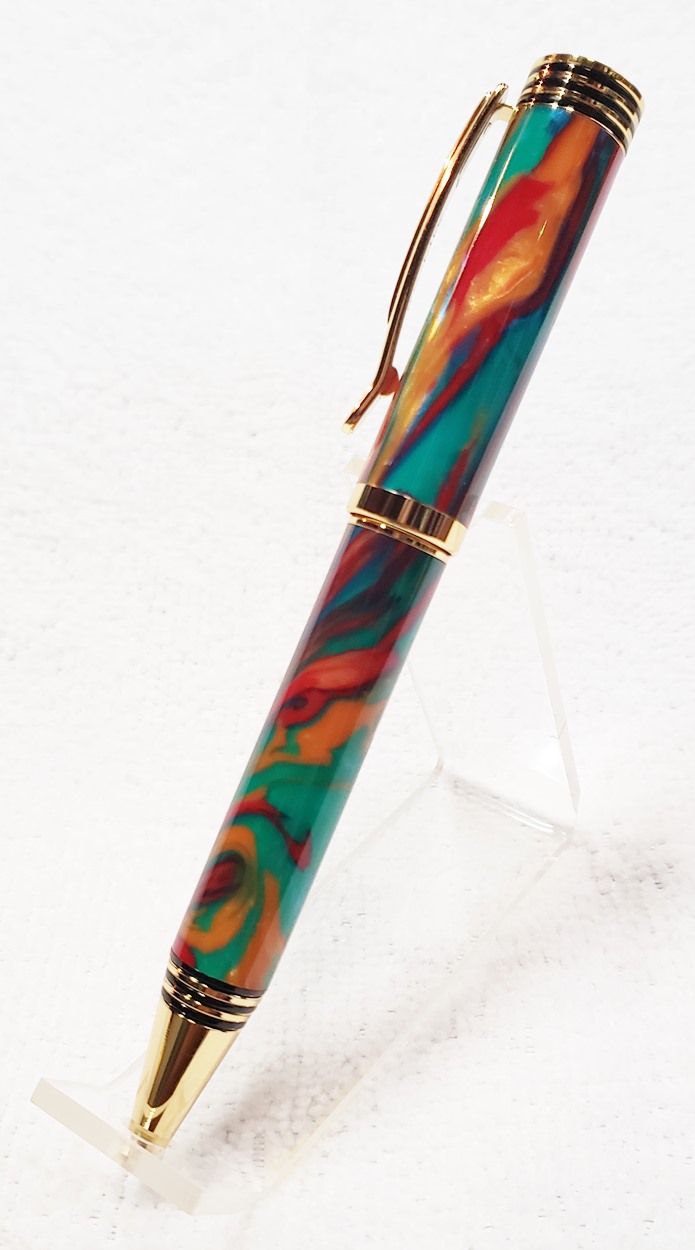 This is a Dayacom Oscar, in gold and black chrome, from Turners Warehouse. The blank is an inlace acrylester called Tie-Dye, from Woodturningz. I like the combination more than I thought I would.
