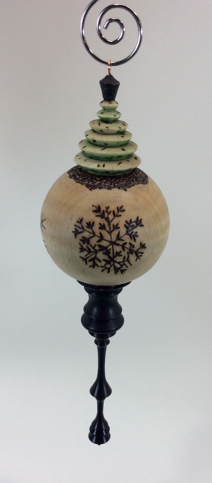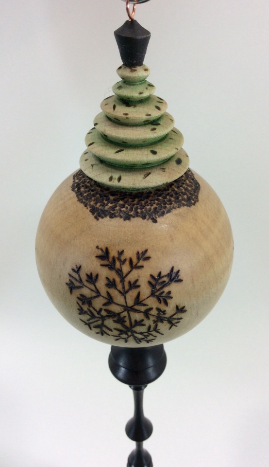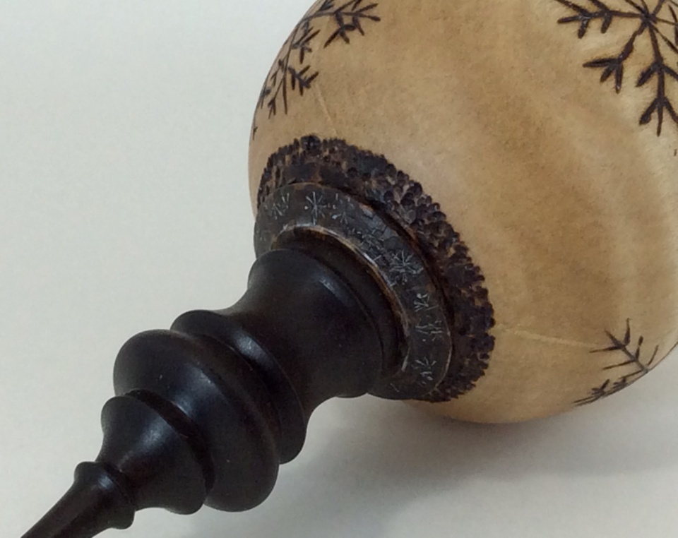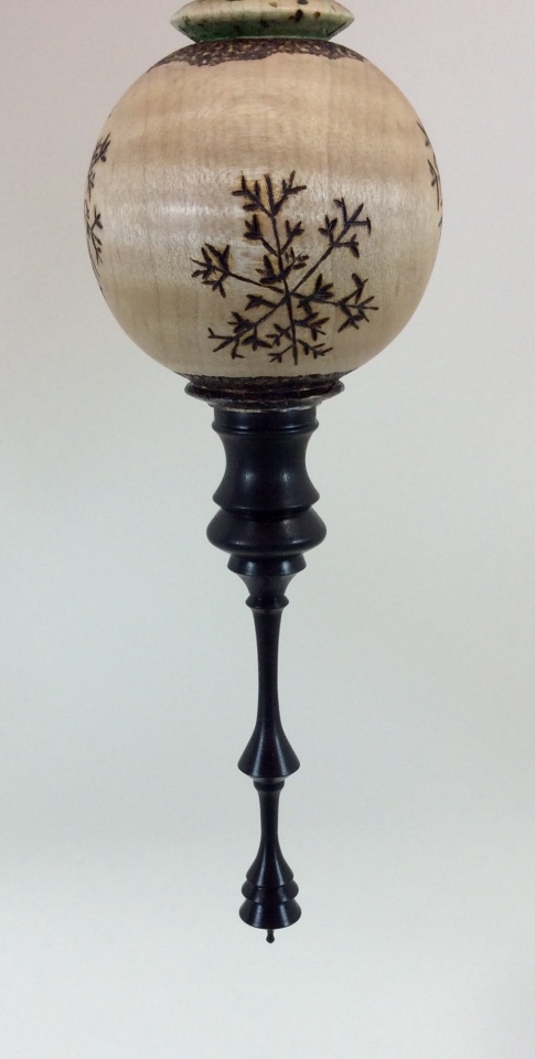 My numberone hubby turned a beautiful curly maple ornament with an ebony finial and had me do some wood burning on it. I was able to wood burn, wood punch and gild, and paint. I didn't have any stains or paints so we used a colored pencil to get some pencil shavings and mixed some food safe oil to make a wash effect. We had a fantastic time working together on this. Charlie_W is awesome!:angel: