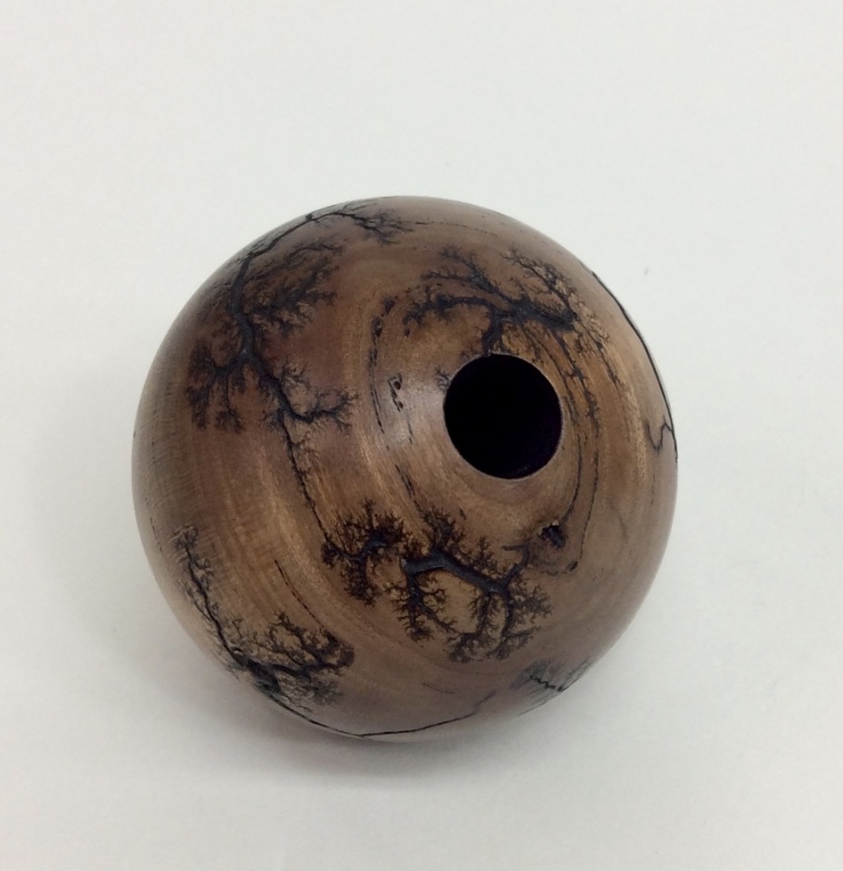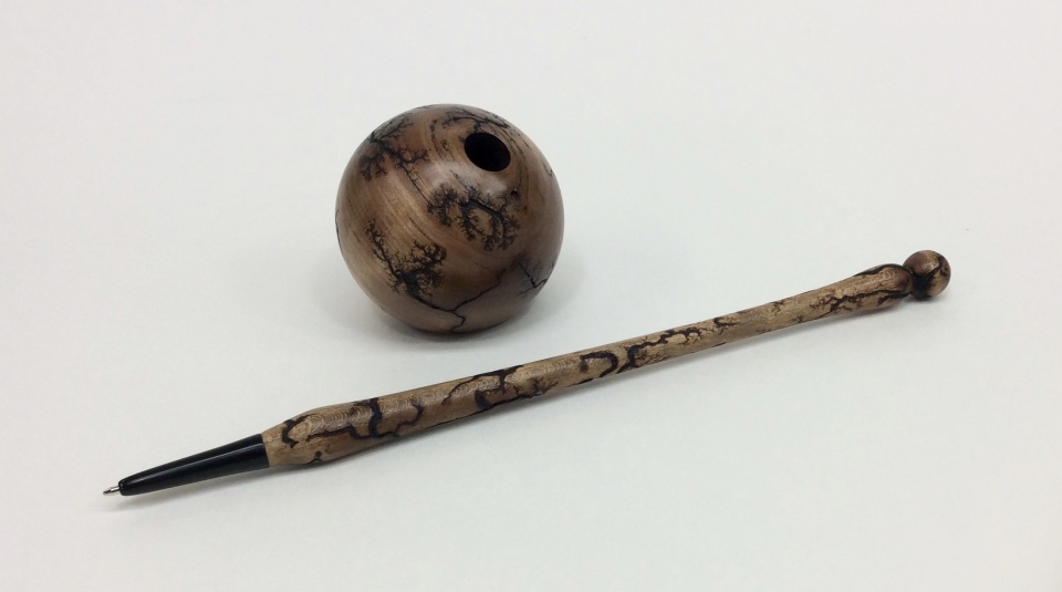 The base sphere was hand turned between centers (no sphere cutting jig) and the hole for the pen nib as well as the foot area were turned on the lathe as well.