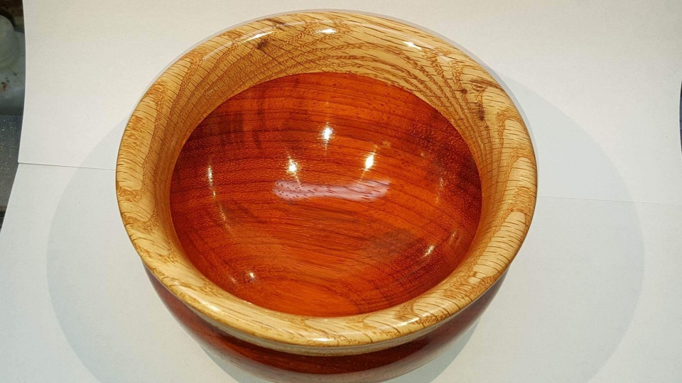 Here is my latest bowl...Padauk and Red Oak. Evelyn gave me some bowl blanks for Christmas and a 2"x 6" piece of Padauk was one of them, I added a piece of 3/4" Red Oak to what would be the top. I sanded from 80 grit to 12000mm. The outside has 6 coats of Pen's Plus I still need to apply 4 more coats to the inside. I happy I didn't blow through the bottom of this bowl and pleased with how it came out. All C & C welcome.