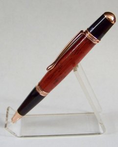 This is a Wall St II copper kit I got over at WC today. I started out using an acrylic which tore out on the end. Then lace wood and the same thing happened. Well I noticed my bushings only after using twice are rounded off already which is really weird for a bushing set. I know I might hit them etc when turning but even my cigar bushings I have had a while are still ok. So with that in mind I grabbed a piece of Padauk. I kept the ends a little thicker and sized with the bottom part of the kit. Good reason to have calipers I know. I sanded dry up to 600 and then applied HUT Crystal coat, HUT PPP wax bars. I then did 5 layers of Med. CA and did wet MM all the way up. I wasn't sure how the colors worked at first, but I think they look ok together. I am giving this one to my wife.