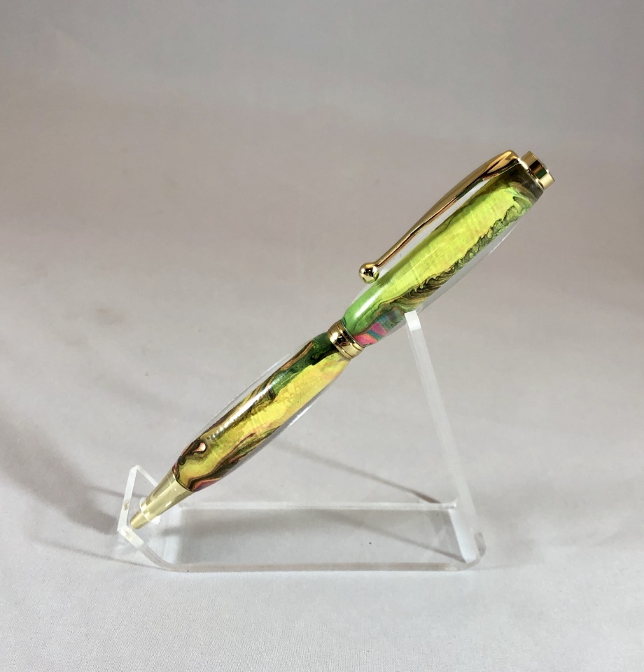 This is one of my favorite techniques. I rolled the brass tube in paint that was leftover from a paint pour and then cast it in Smooth-On's Crystal Clear 202 resin. It's assembled on a Slimline.