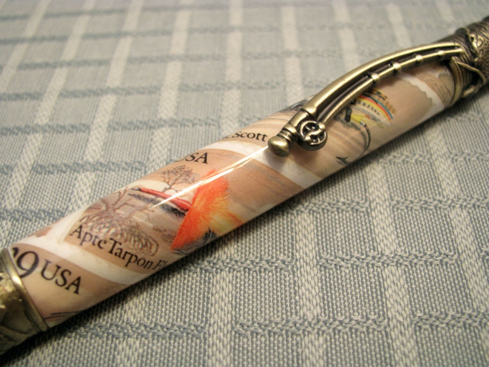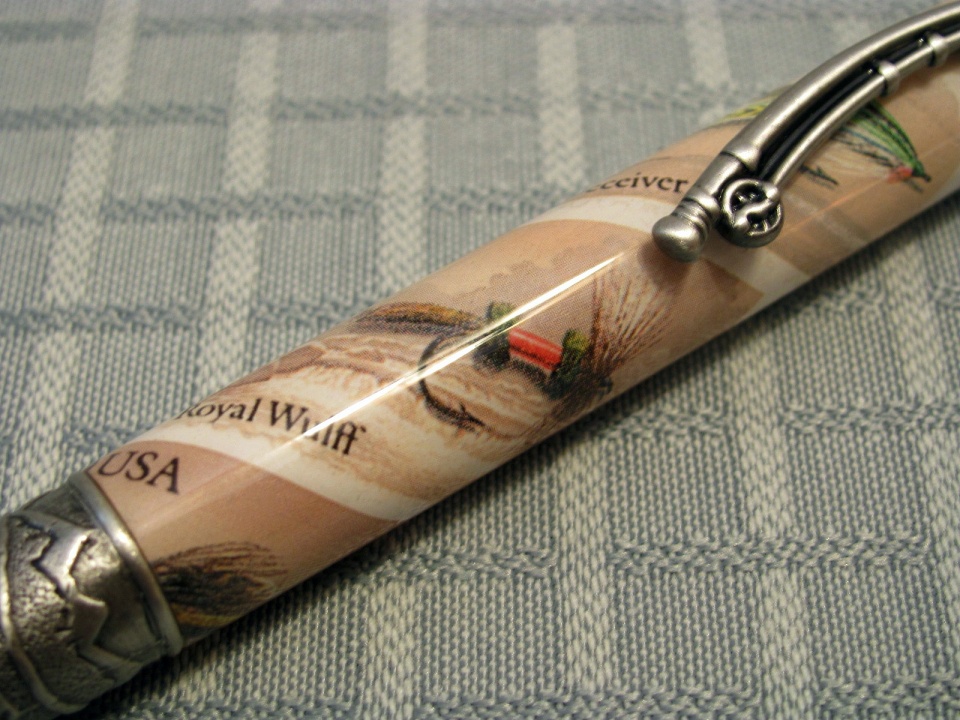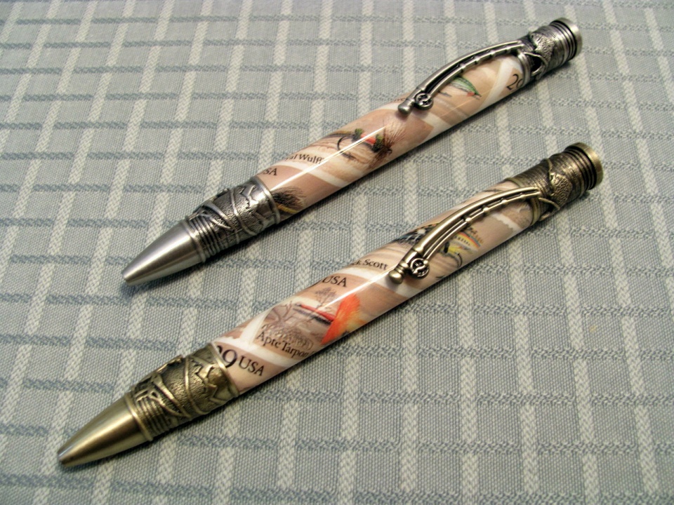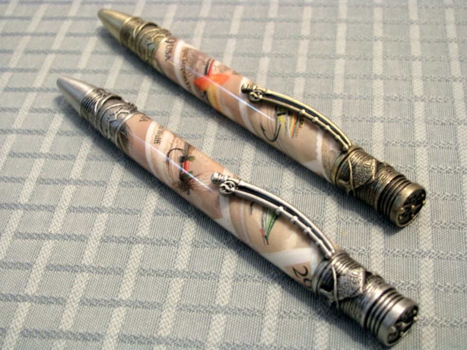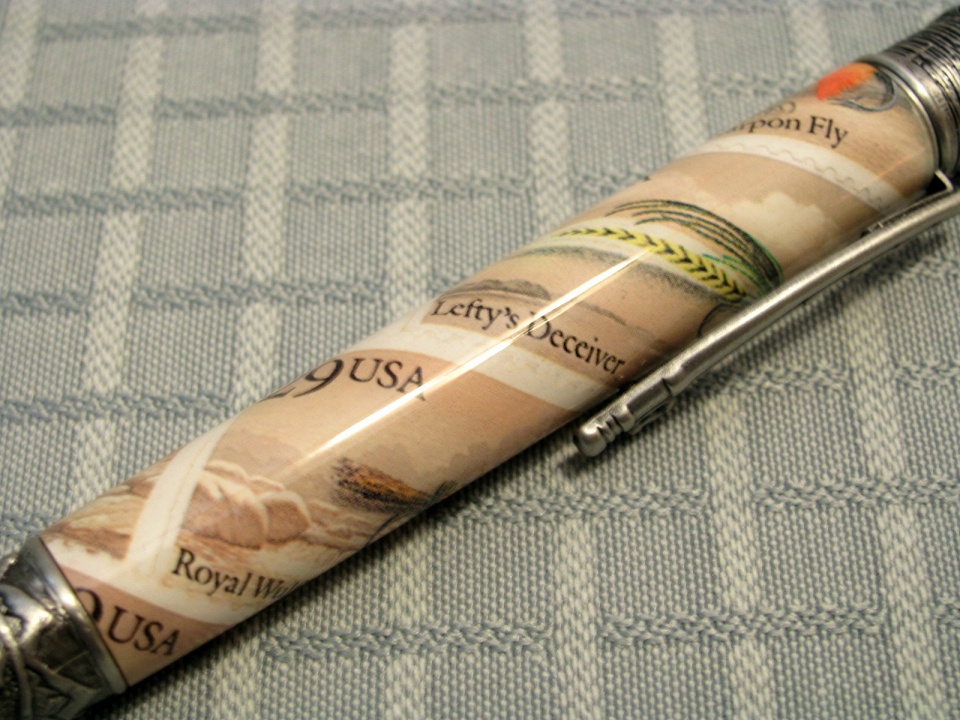 I have wanted to pair up the PSI fly fishing pen with the USA fly stamps,and today I was able to finish them up.I really like the details they put into this kit.I did them decoupage-style with ca,This pen feels good to write with,too.I really like it.I hope they appeal to some fly fisherman someday!