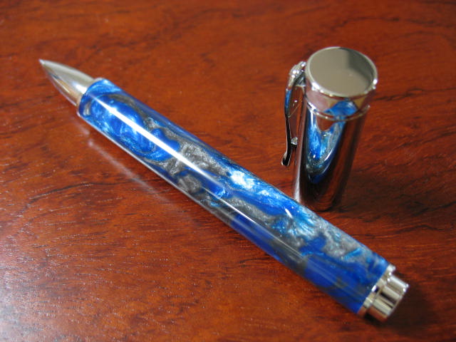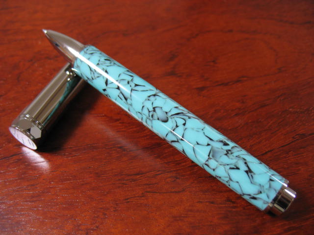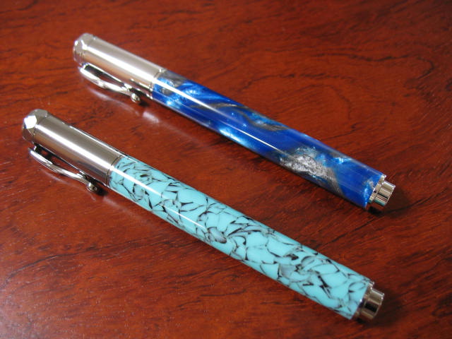 The bottom blank is from beartoothwoods.com (southwestern green, the inside of the blank was painted green) and the top is from our beloved exoticblanks.com (Cetacean seas, the inside of the blank was painted blue). Both pens MM to 12,000 followed by plastic polish.