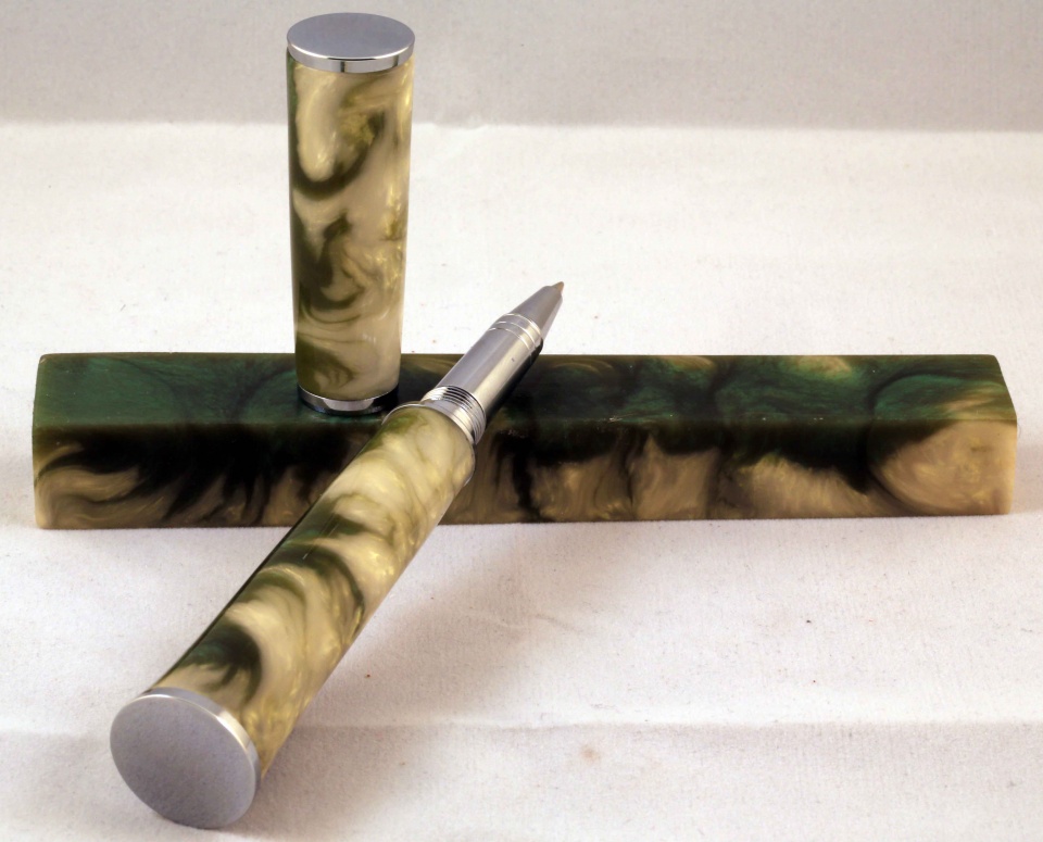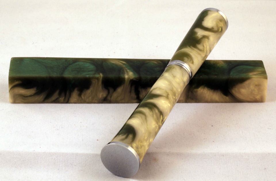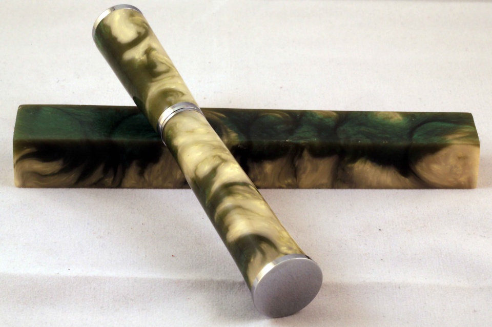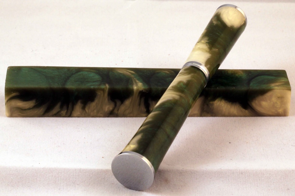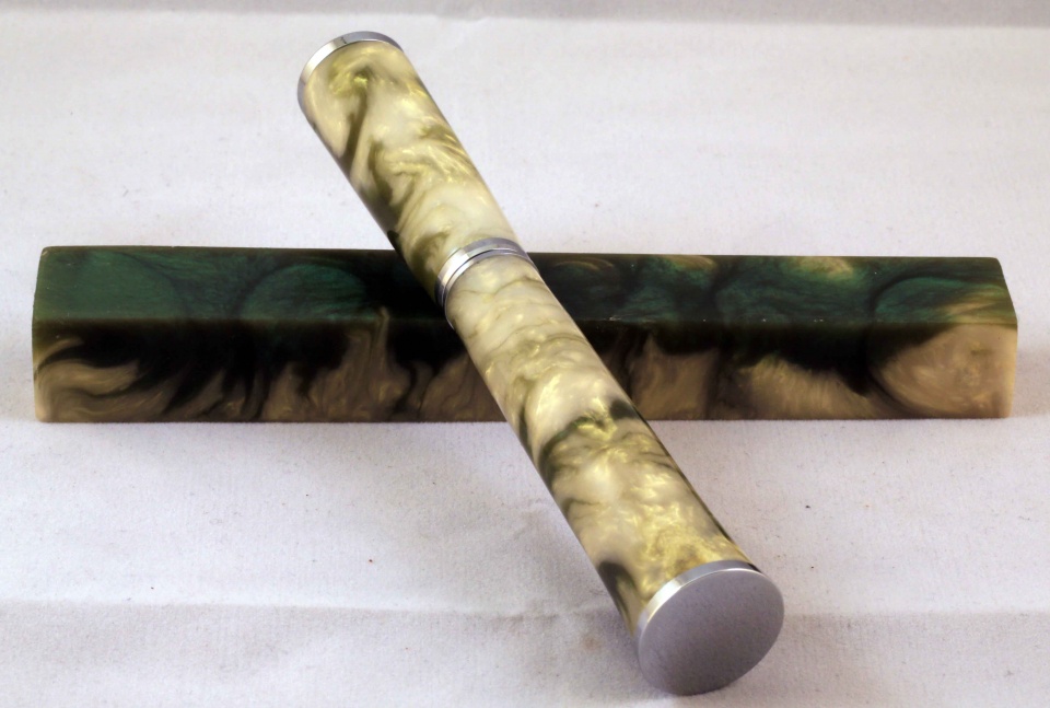You must be wondering about the title. Well this is a PR resin blank that my son and I cast together. I wanted to try the gold pearlex and see how it does with green. Then I thought of a name for the blank, as my son has been naming the previous blanks,( he won 3rd place with his fire and brimstone pen in the 14-16 contest).