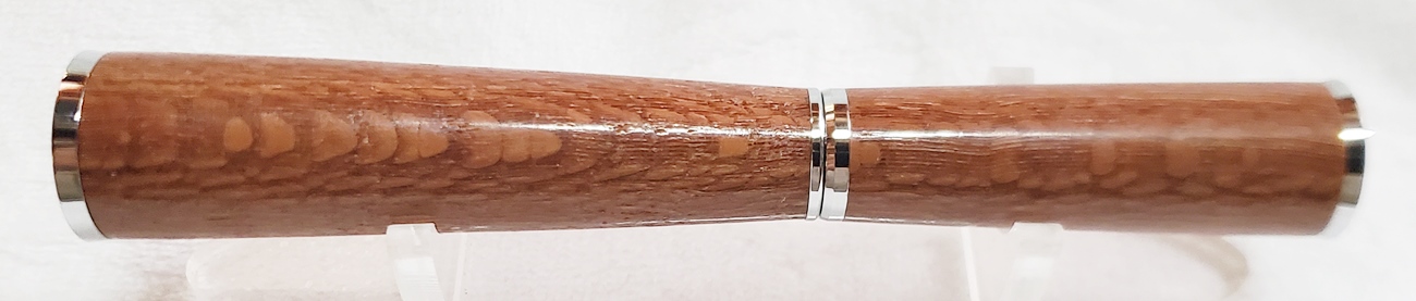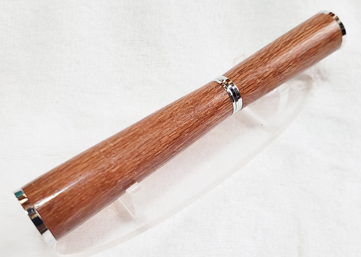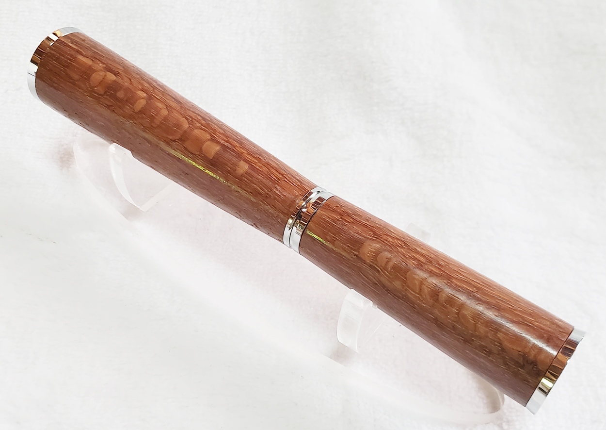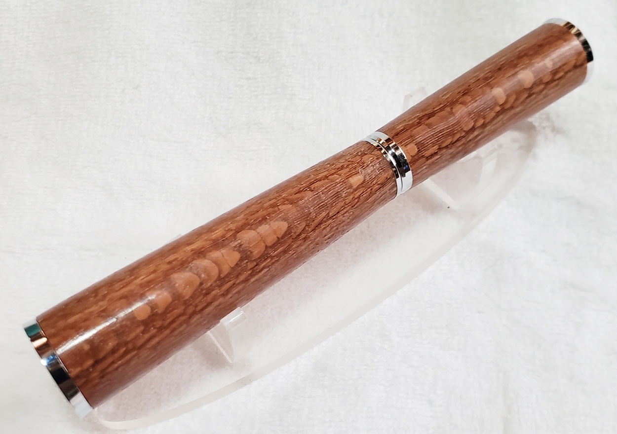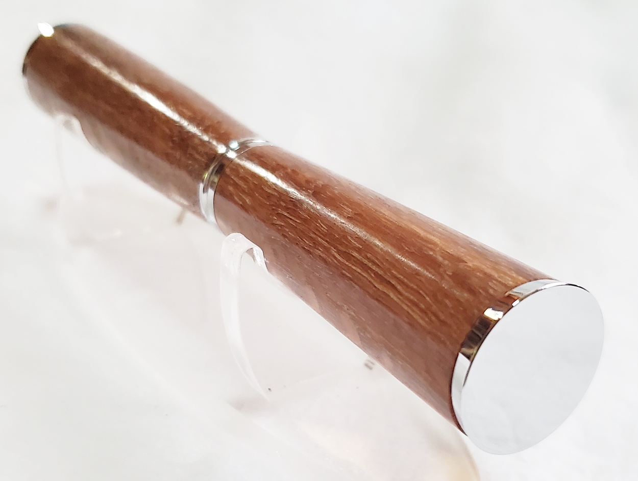 This is a Panache rollerball desk pen in chrome, from Crooked Mill. The wood is leopardwood from Woodcraft. The finish is Mylands and carnuba wax.