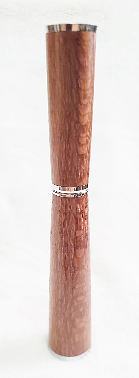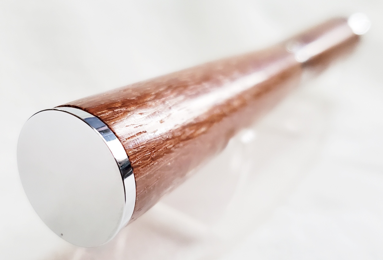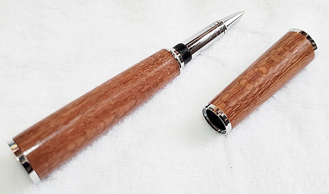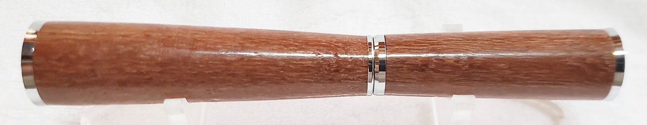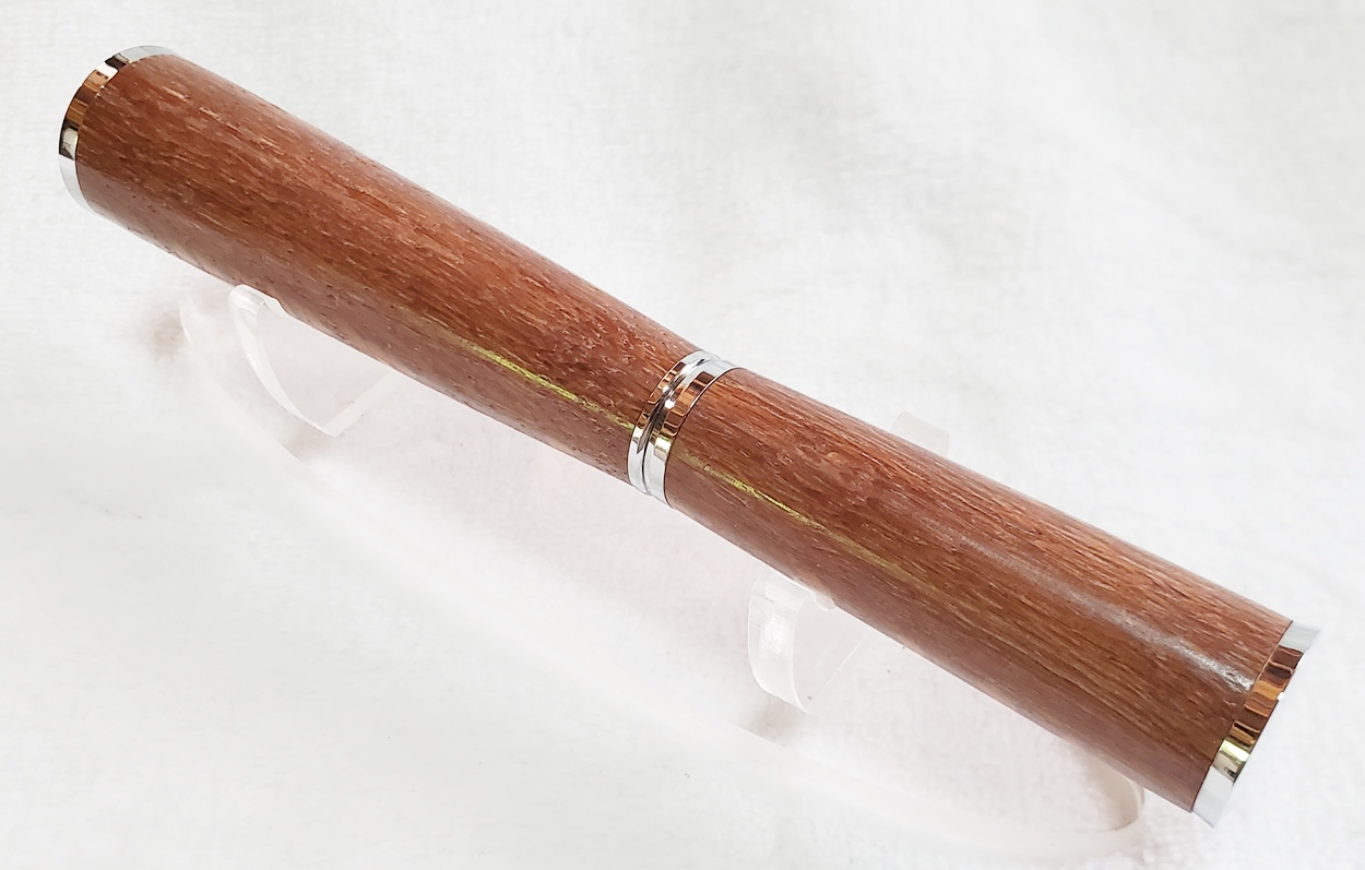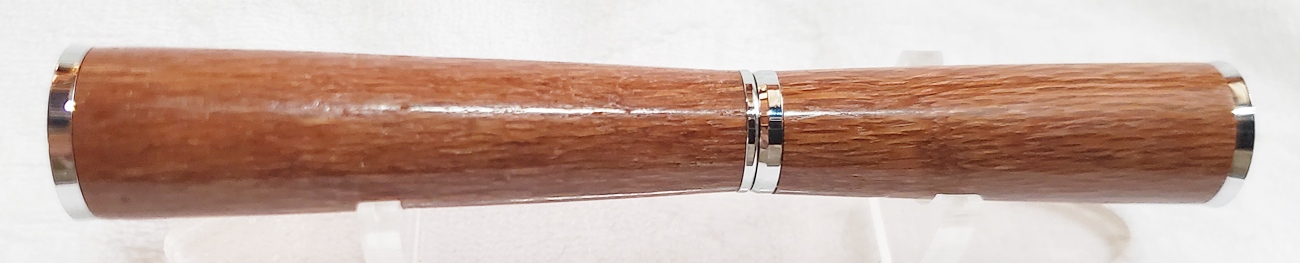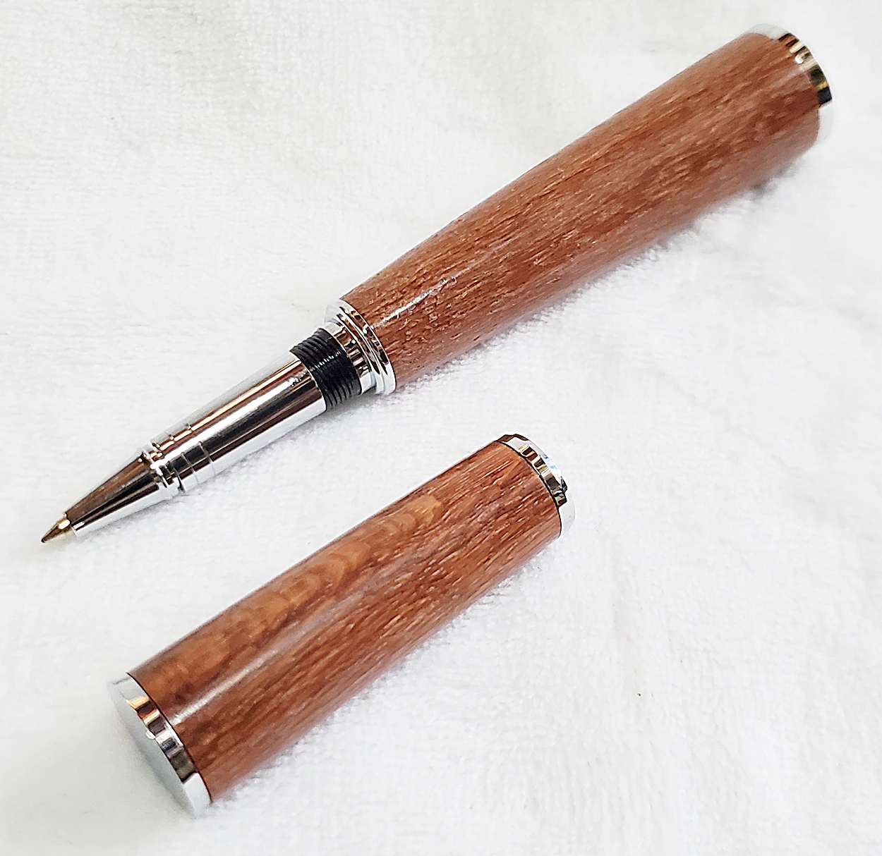 This is a Panache rollerball desk pen in chrome, from Crooked Mill. The wood is leopardwood from Woodcraft. The finish is Mylands and carnuba wax.