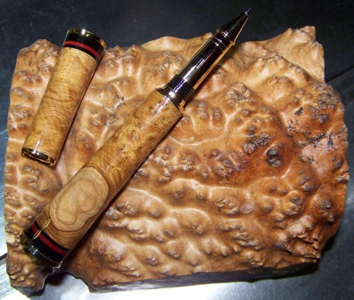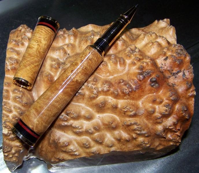 I purchased a mix of about 15 Brown and Red Mallee burl's similar to the one that the pen is sitting on and this came from the cuttings of one of the burl's. The rings are Black Gaboon Ebony and Pink Ivory.
