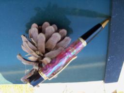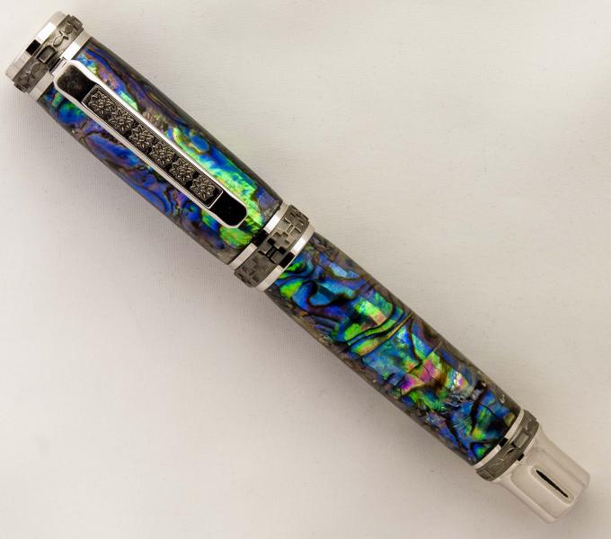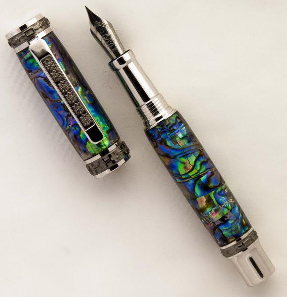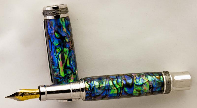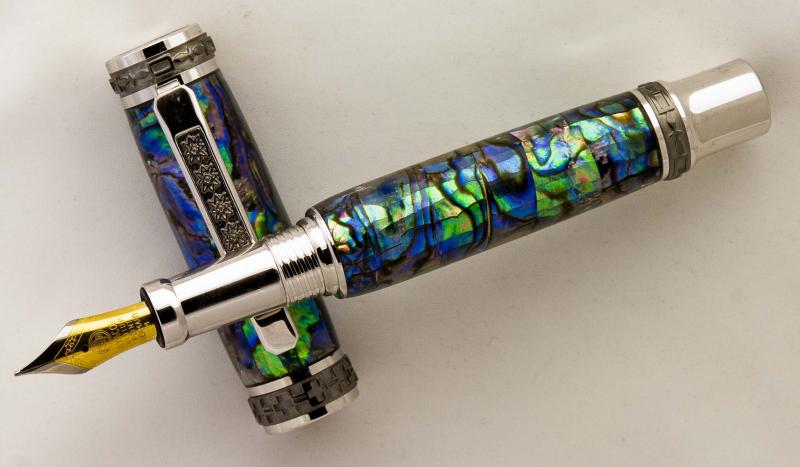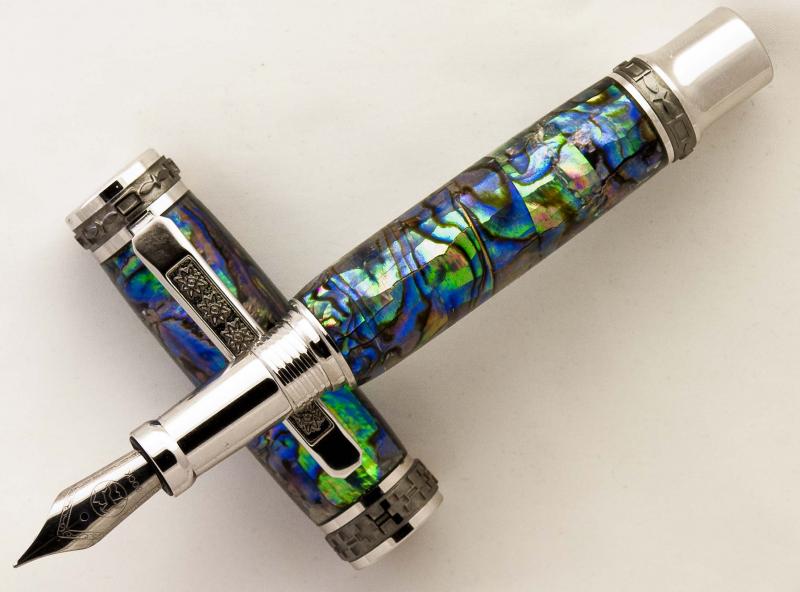 Turned it this A.M. It's a Paua Abalone blank from Classic Nib on a Rh/Blk Ti Emperor Fountain Pen. The true magician behind this creation is Ken Brown who makes these works of art. Hope you like it. Doc