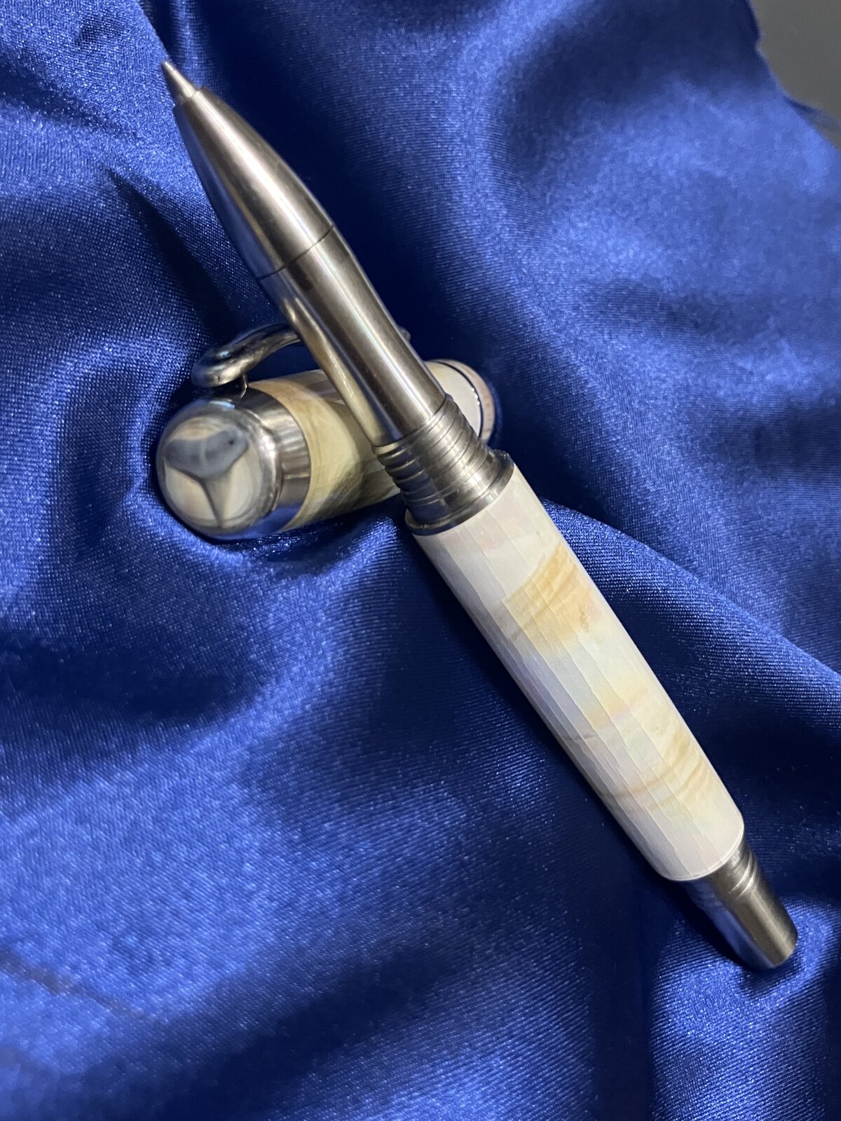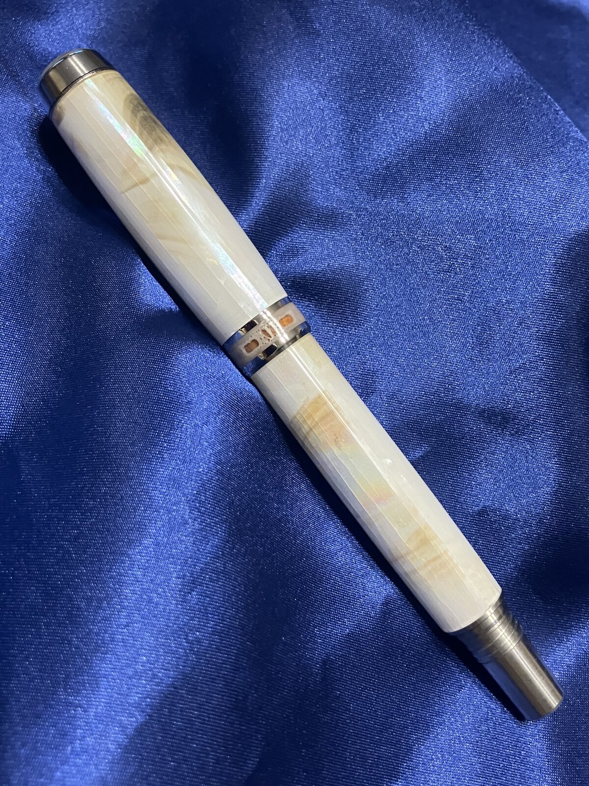 This one gave me more headaches than any pen so far. Thanks to John U. for his input trouble shooting some of the issues. The pen and cap is Light Tahitian Pearl. For some reason the pen decided to give me fits during the casting process. The center band is an actual shark vertebrae. I knew I wouldn't be able to fill it with CA on the center band so I cast it in clear resin then mounted it on the pen part. That actually went fairly well. The shark tooth was a different story. Installing the shell was easy. When I started filling it in with CA I had trouble with voids and bubbles. I lost count at 12 attempts. I decided to make a mold and cast it in resin. That was the ticket as I achieved it on the first try. I'll give this idea another try with a few tweaks. There's a couple of things I'm not happy with but I was ready to finish it up. Questions and Comments are Welcome.