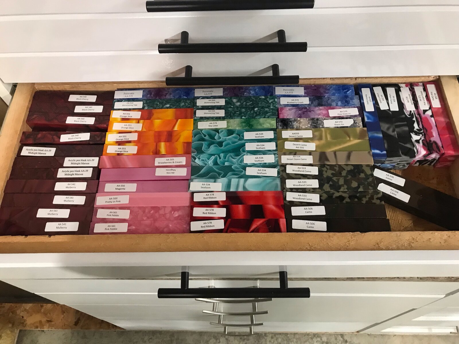 Here is a cabinet I just finished to store all of my pen blanks. The carcase is from the clearance section of Ikea which I purchased for $24 a few years ago. The drawers are made from pine cutoffs and Hardy board left over from the construction of my shed. The drawer fronts are made from MDF scrap I had laying around. The drawers can hold two layers of blanks.