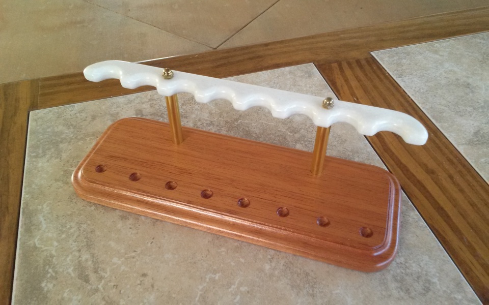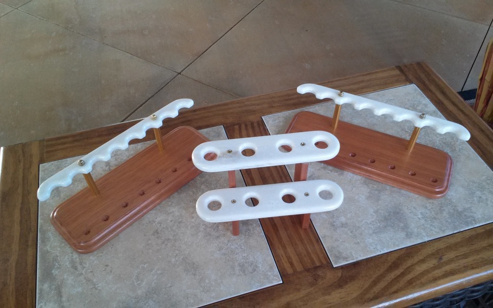 Here are a couple of projects I have been working on. The bases are made from mahogany, the rails from some Corian and the support posts from gold anodized #10 knitting needles. C&C welcome. Thanks for looking.