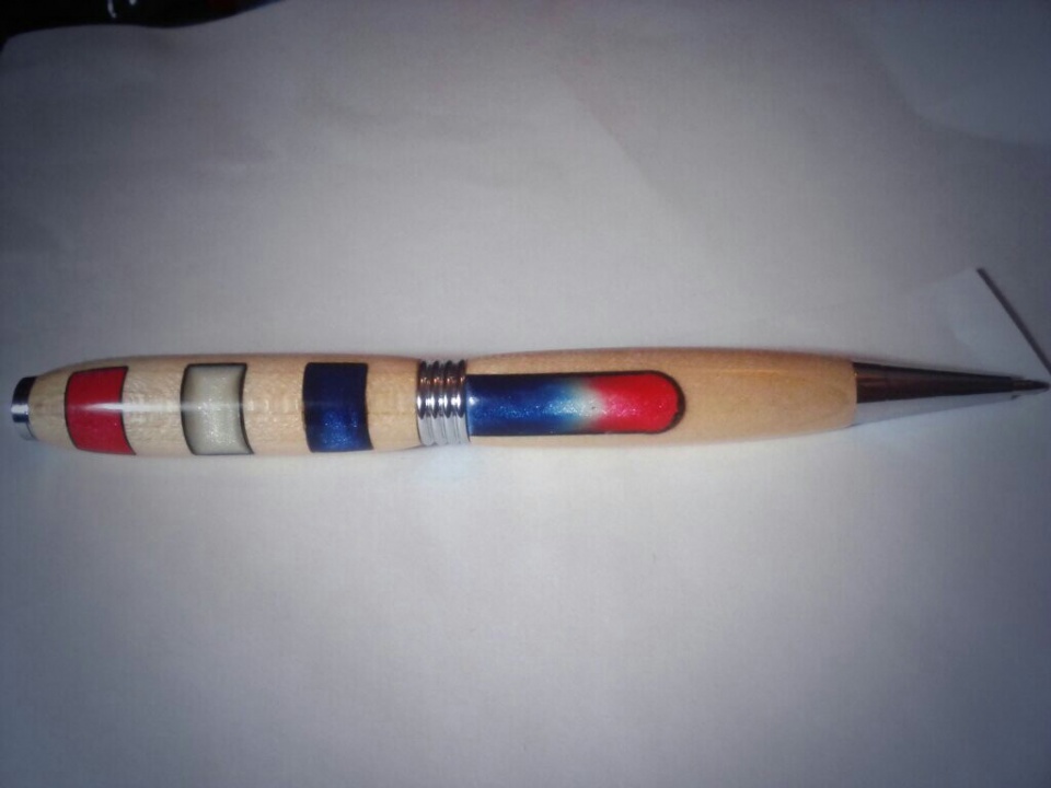 thanks Plantman, OZturner, This was my first post so I was not sure if the picture would even work. Next time I will give more of a description and write more about the pen.The colors Red, White, and Blue are the colors for the American flag, that's all. The inlays are made of polymer clay, I have been playing with clay for about 5 years and turning pens for about 2 years(still have a lot to learn). I keep trying new ways to Inlay the clay into the wood and have more blanks in the oops box then I have pens:biggrin:. You can follow my twitter page if you want and shows some of my current experiments(mistakes) @AFWoodart, or check out my webpage to see some other stuff I make, www.afwoodart.com . Thanks