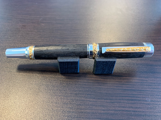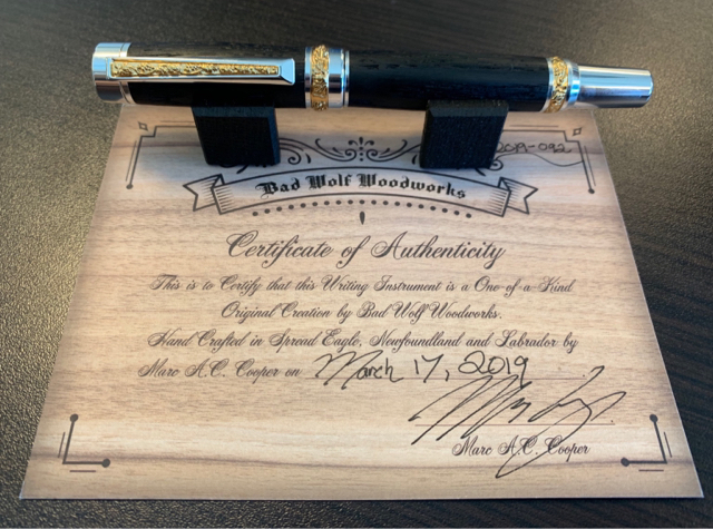 I was asked to make 3 pens for an upcoming Live Charity Auction. This is the first, which comes with matching Cufflinks. It is made from 5400 year old Bog Oak and comes with a Seal Skin pouch, Carbon Dating Certificate from Laval University and Certificate of Maker.