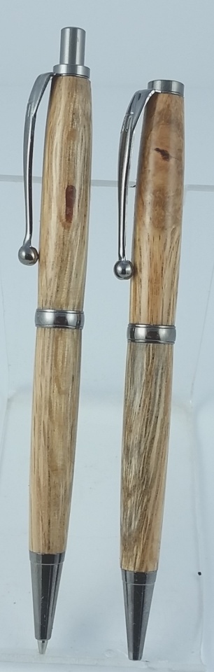 I just finished a project for my wife that I used some Ash I picked up from my father quite a few years ago. I had some leftover pieces and a pen & pencil set and decided to use the wood and kits to make a nice little set. The pen blank had a little knot in it which I was able to fill with some Cyano and the pencil happened to have a worm trail in it after I had finished the turning. I filled it with some Amboyna dust that I had collected and then used Cyano aver the filling.