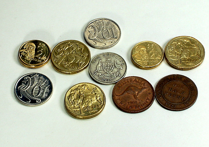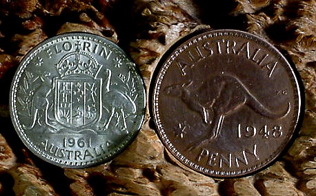 The Australian Penny for his birth year and the Aussie Florin for the Australian Coat Of Arms. The Marsupial Kangaroo and the flightless Emu indigenous to Australia.