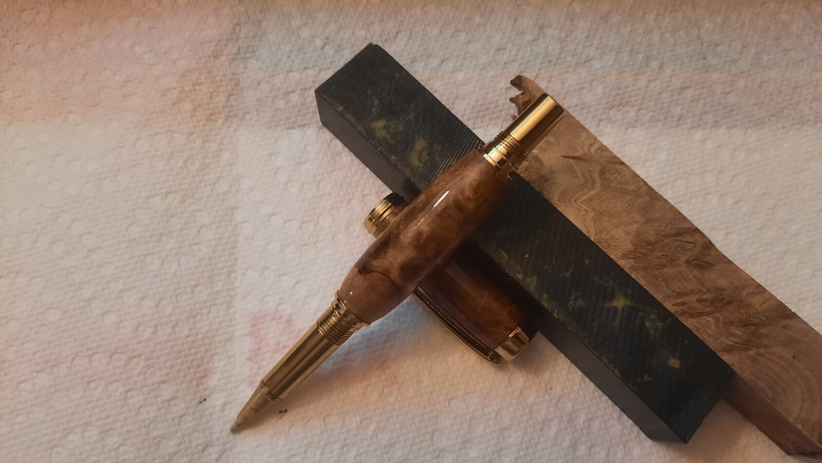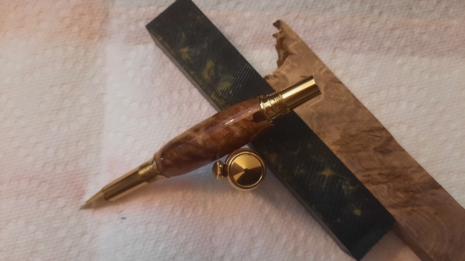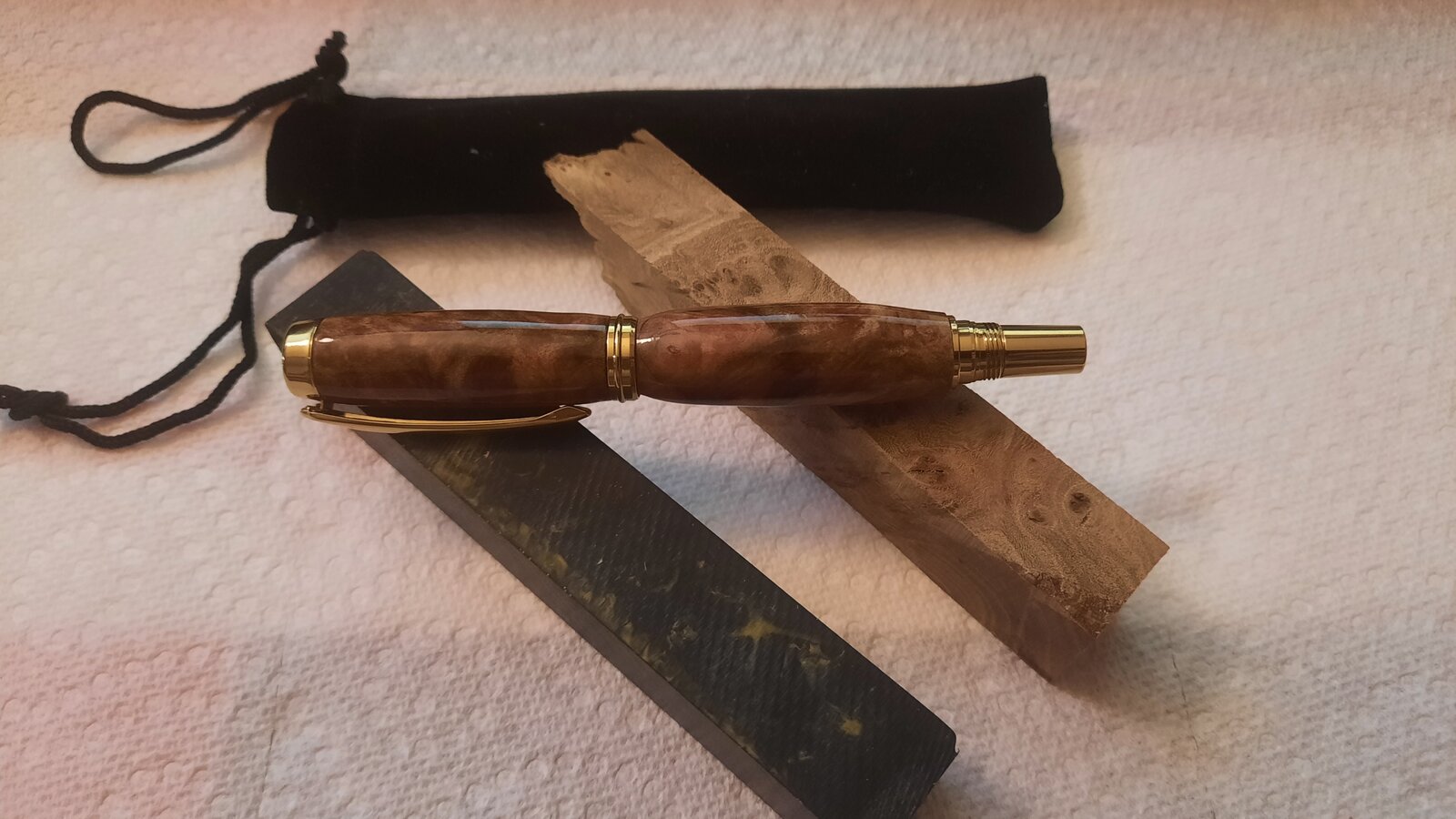 A gold Caballero frame with American Elm Burl. The blanks go with the pen and the one is one from my "shop"