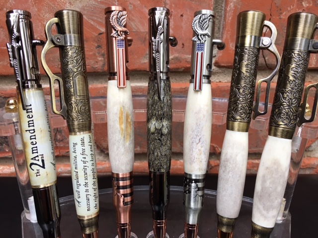 I don't do many shows, but a friend and fellow turner and I have one coming up as a fund raiser for a local school. In the past the bolt action/lever action pens with deer antler have done very well. I also included a couple "2nd Amendment" pens, and "Salute the Troops" bolt action. As always - comments/critics are always welcome.