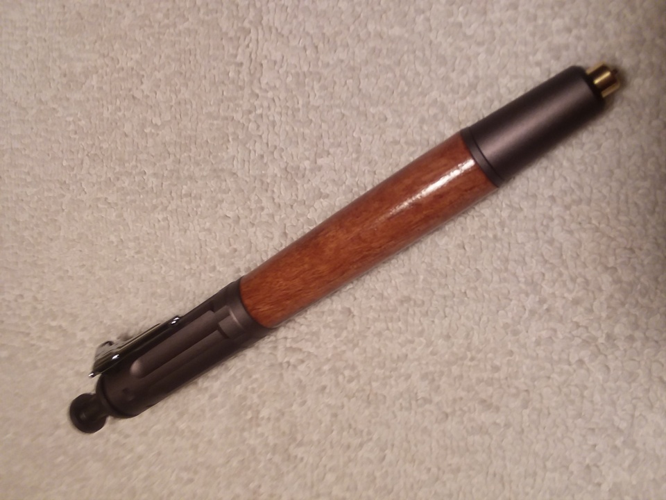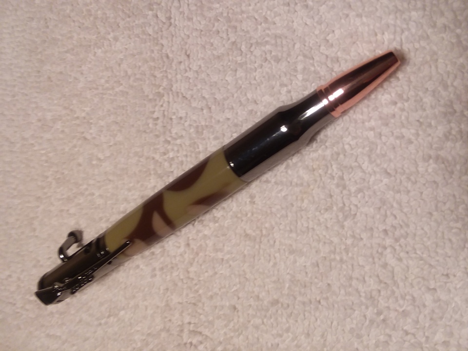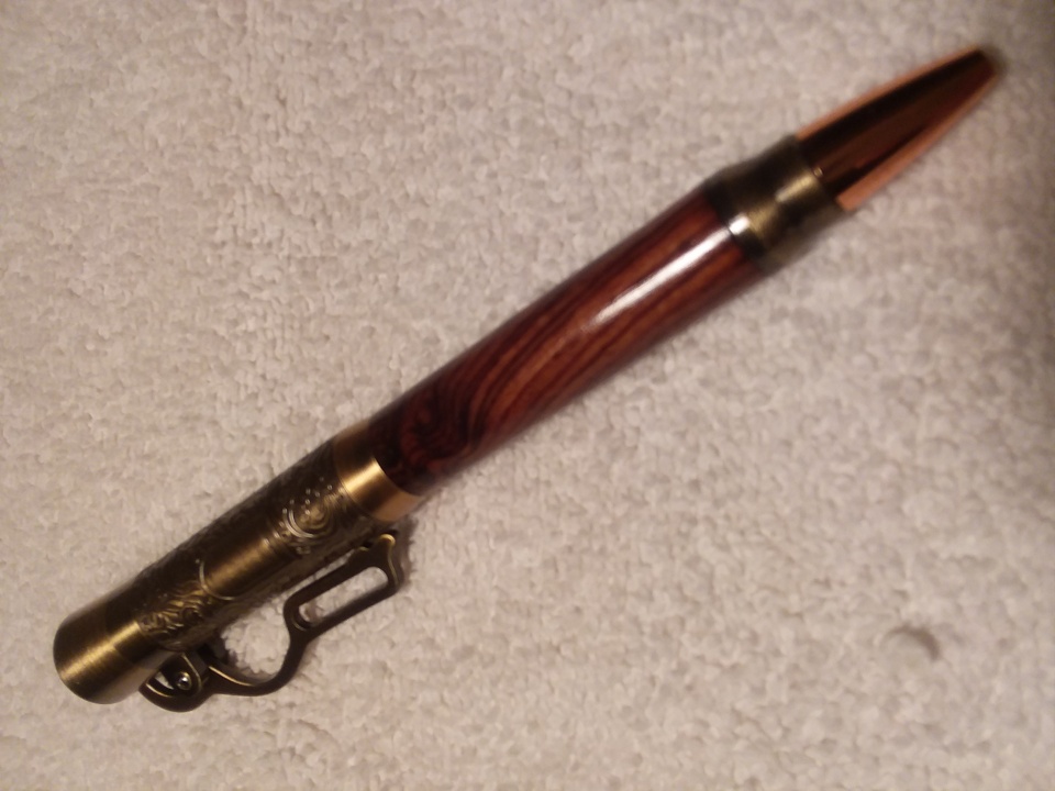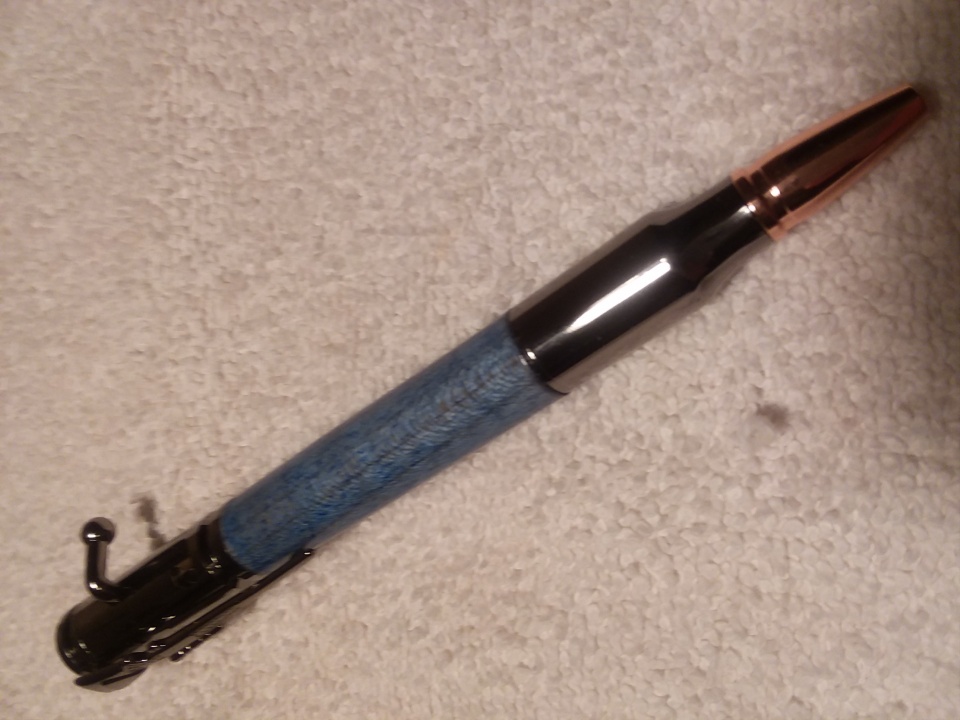 Left to Right- Revolver, Gun Metal, Quebracho; Bolt Action, Gun Metal, Desert Camo; Lever Action, Antique Brass, Cocobolo; Bolt Action, Blue Dyed Maple.