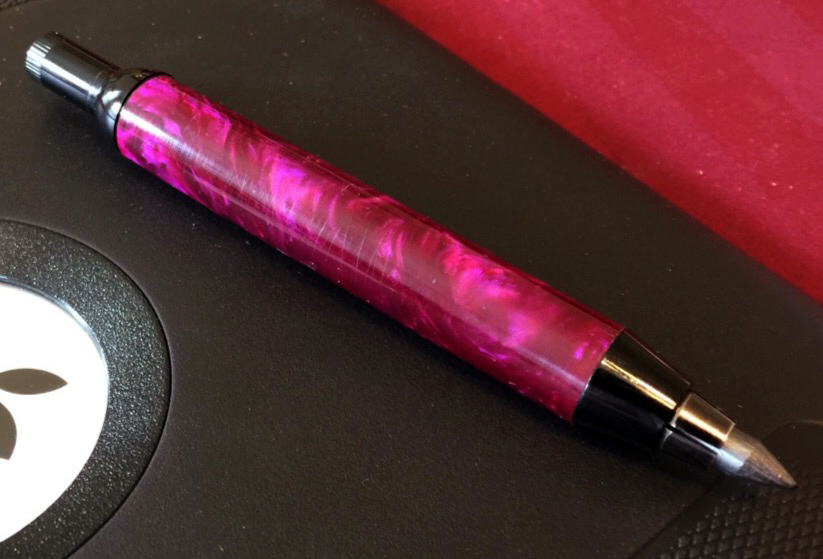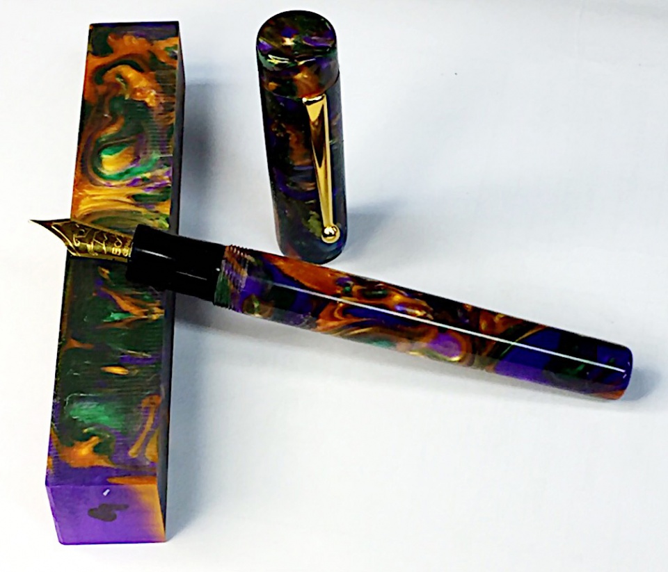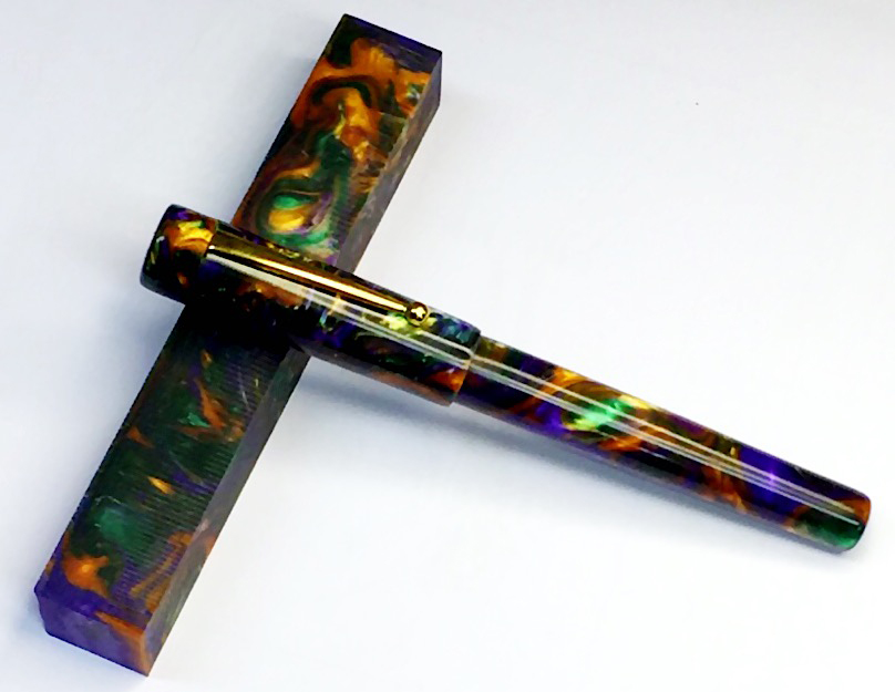 These are pens that I gave as gifts to two very brave young ladies who are patients of mine. Both pens are made from blanks created by Eugene Soto. The first one is a sketch pencil in Wizard's Purple Mist and the second is a kitless fountain pen made from a blank called Full Spectrum. Lighting on the first two pictures is different in order to give you an idea of the beauty of the resin. Hope you like them. Doc