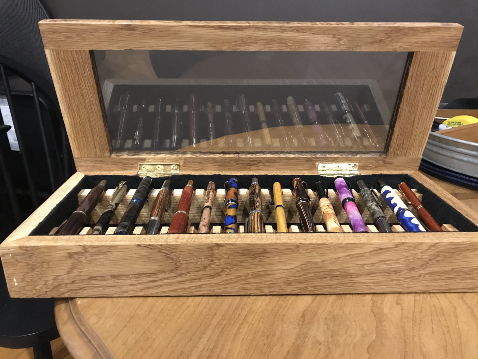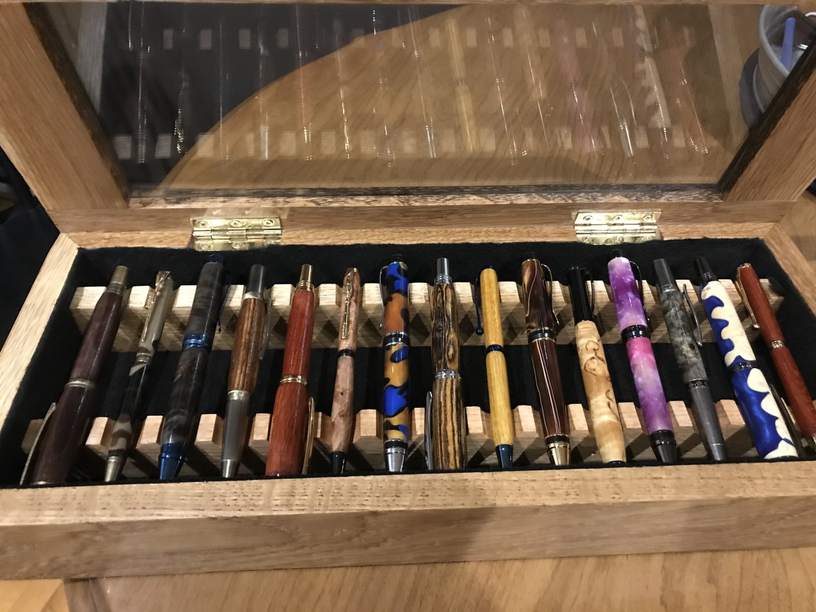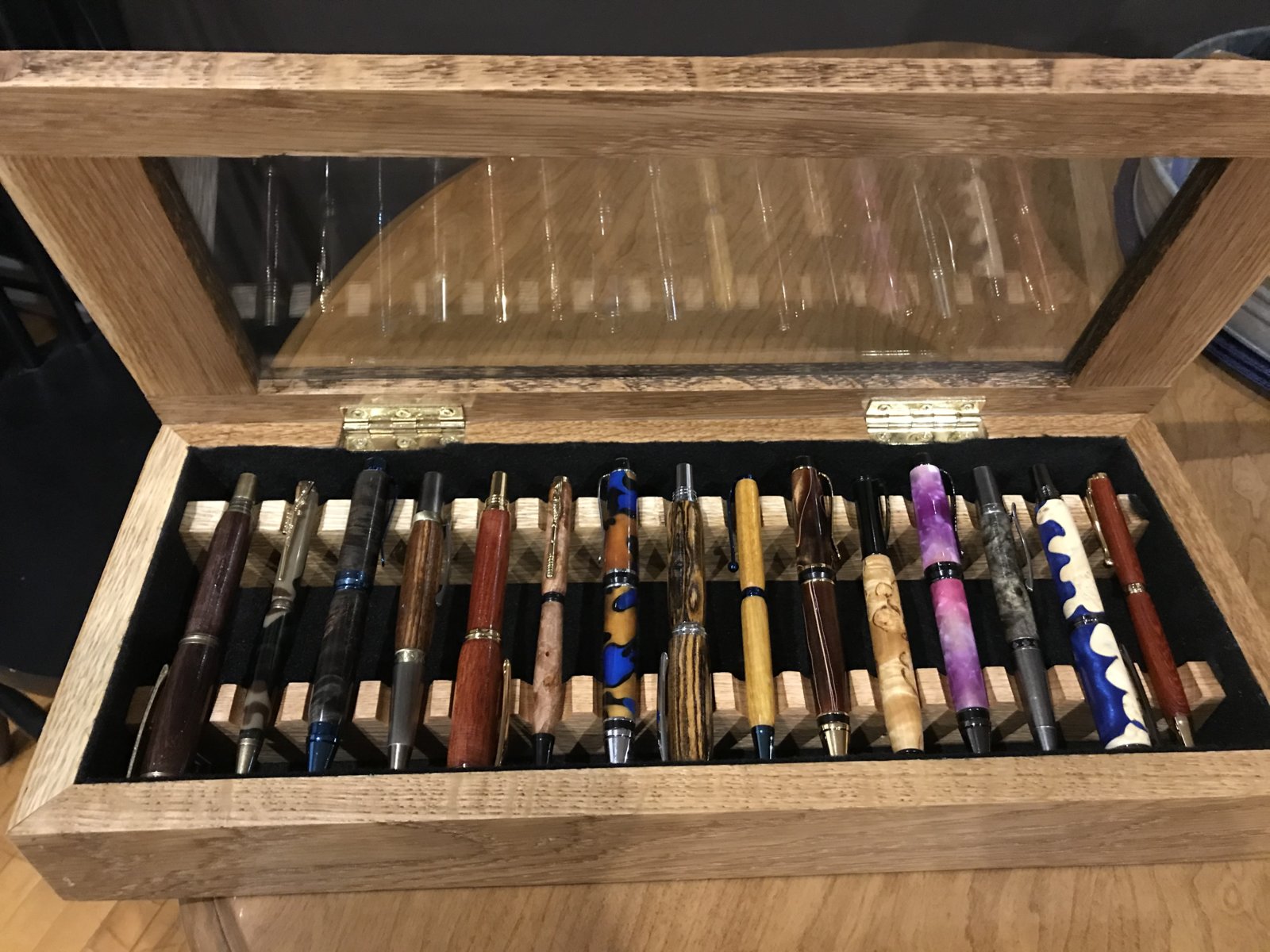 I was getting tired of having all my pens individually boxed or sleeved for when people would come over to look/buy pens. So I decided to take a day away from turning, to build a display case. Really happy with how it turned out.