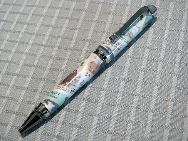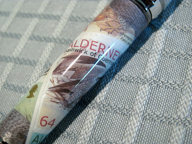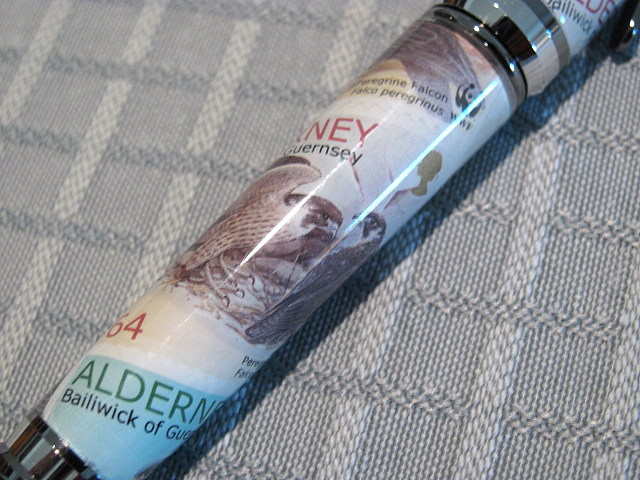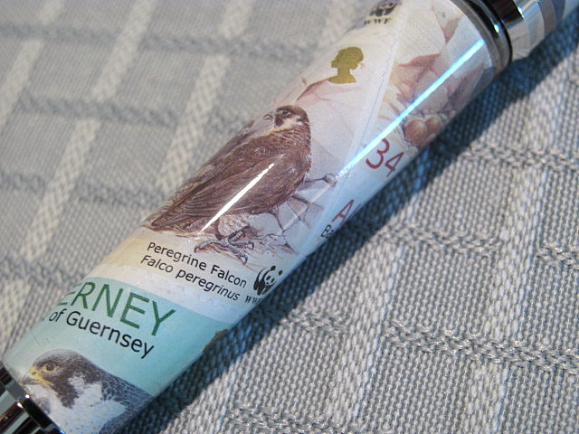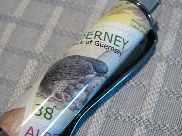 Here's how my latest pen turned out.It tells a story in stamps,of the family life of a pair of Perigrine Falcons.These neat stamps are from Alderney.