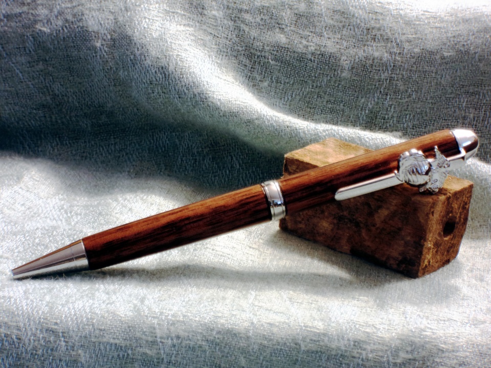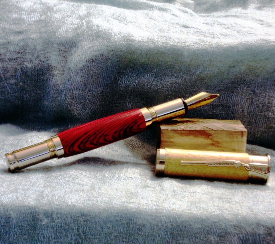 In addition to hanging out with some great folks at the Marines Helping Marines cookout today, I sold four pens and picked up a commission for at least one additional. Three were Euro Style twists with custom Eagle, Globe, and Anchor clips; one in red Dymondwood and Yellowheart with gold hardware , one in red Dymondwood with gold hardware, and one was in black walnut with chrome hardware. The fourth pen was an "Over and Under Shotgun" pen in red Dymondwood and Yellowheart.