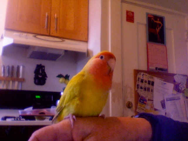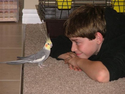 My last year of high school I lived with a friend of the family so I could finish school in my home town... she raised canaries, parakeets and cockatiels... she had Buster in a big cage in the living room and used him to teach parakeets to talk... He had about a 50 or 60 word vocabulary... he drank coke from Monroe's bottle and when you left the room, he always called after you... "Good night"... he watched TV and when a movie would end, he would always "good night, good night".